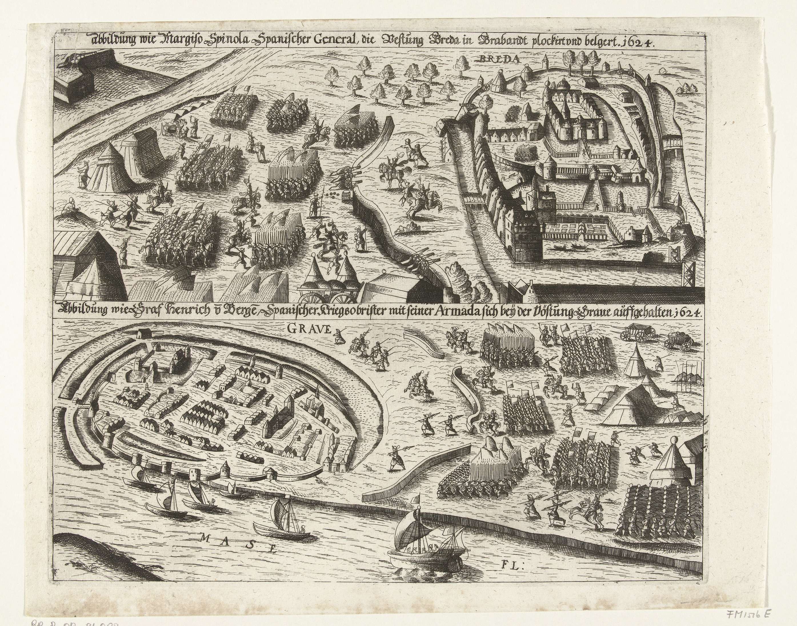 Blad met twee voorstellingen. Boven het beleg van Breda door het Spaanse leger onder Spinola, 27 augustus 1624 tot 5 juni 1625. Onder het beleg van Grave door graaf Hendrik van den Bergh, februari 1624.