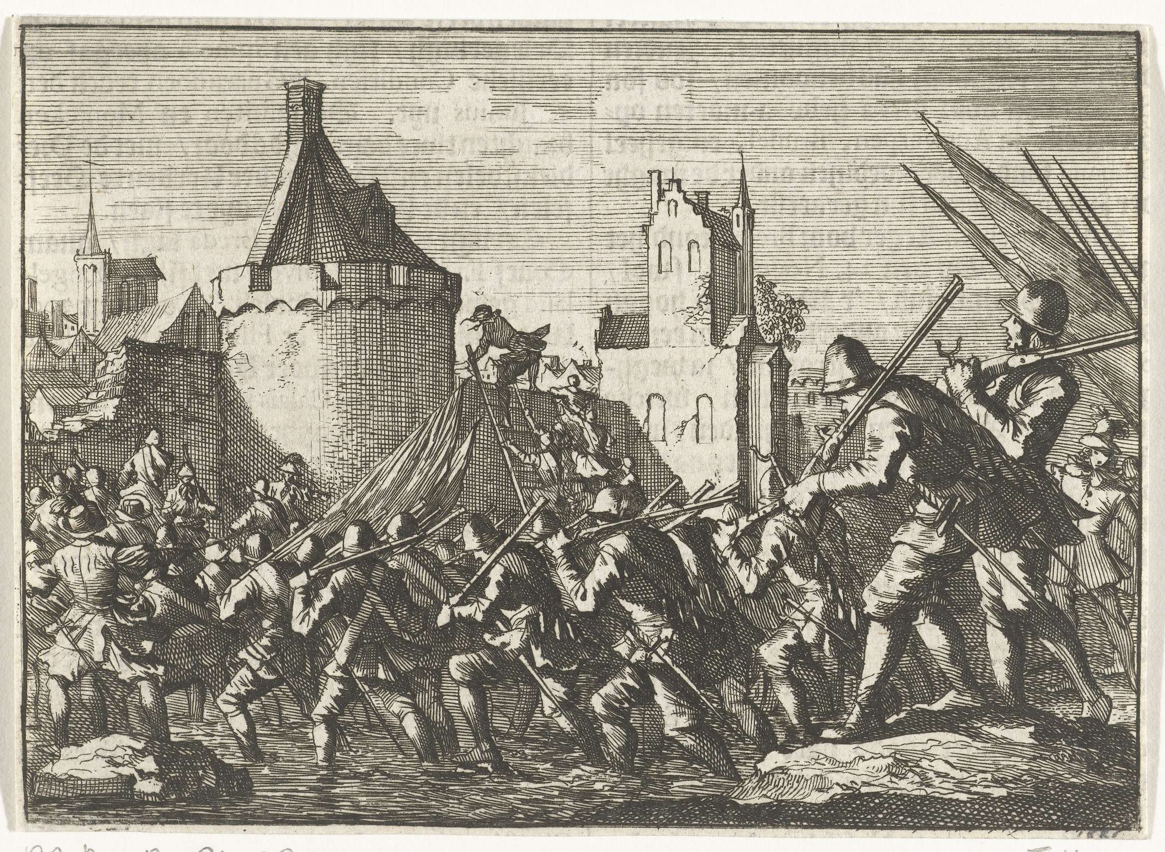 Bestorming en verovering van Goch door de troepen van Lambert Charles, gouverneur van Nijmegen, tijdens het beleg van Breda toen Spinola troepen aan de bezetting van Goch had onttrokken. Bedrukt op achterzijde met tekst in het Nederlands.