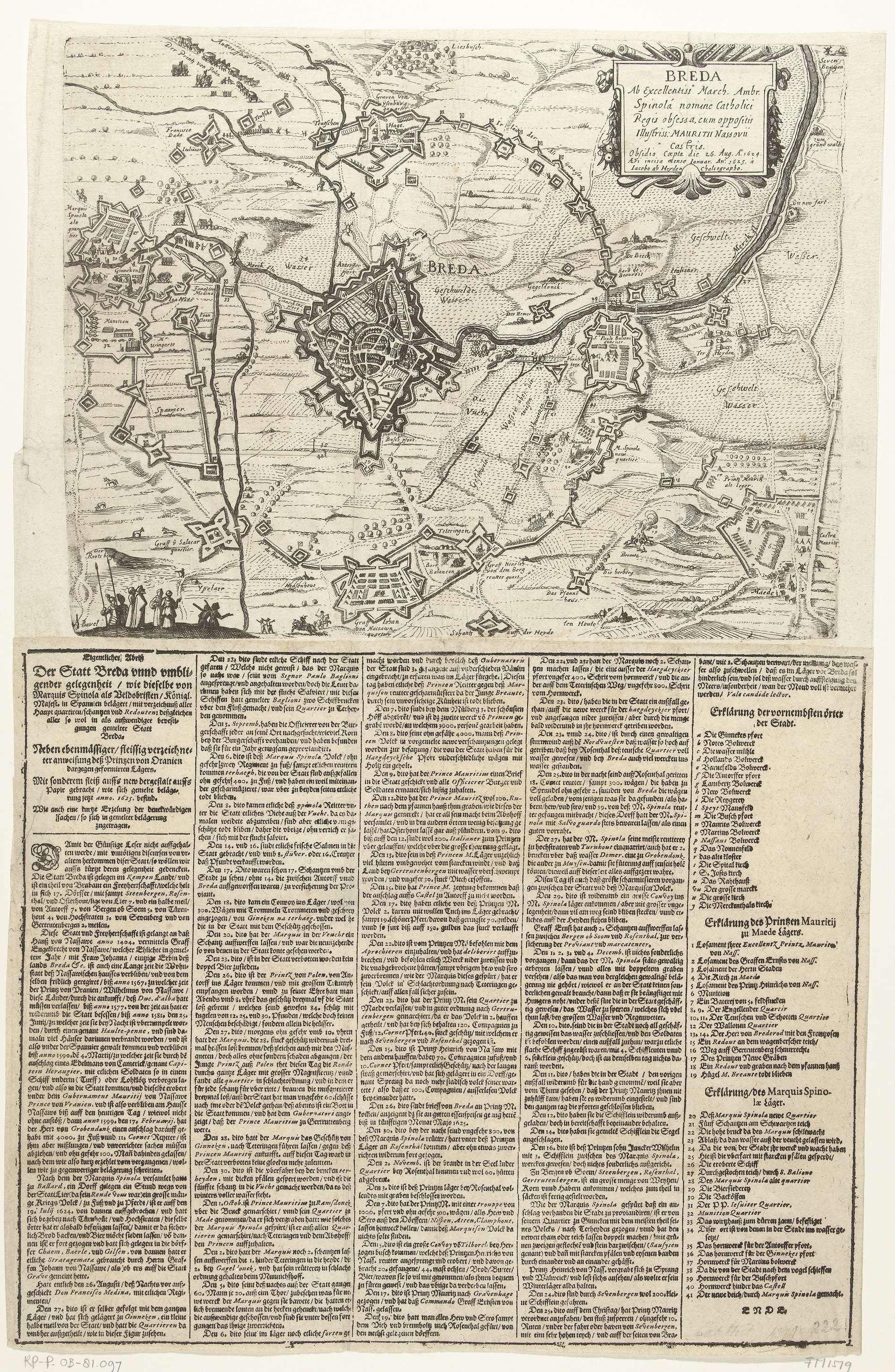 Het beleg van Breda door het Spaanse leger onder Spinola, 27 augustus 1624 tot 5 juni 1625. Plattegrond van de stad met de omcirkeling door de belegerende troepen. Een tekstblad onder de prent geplakt met 5 kolommen tekst in het Duits met een beschrijving van het beleg tot en met 25 december 1624 en de ...
