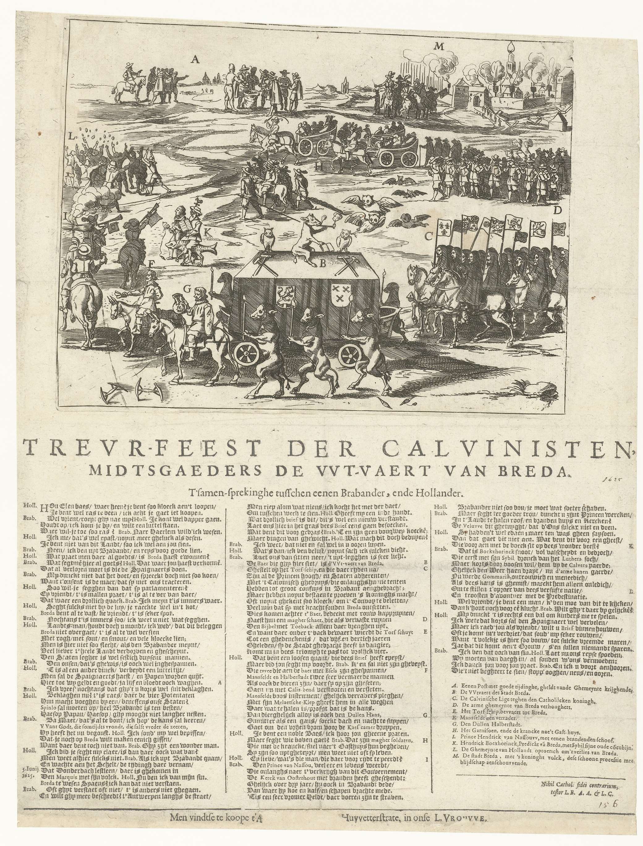 Spotprent op het verlies van Breda door de calvinisten, 5 juni 1625. Begrafenisstoet van een turfschip onder een rouwkleed getrokken door paarden bereden door de graaf van Mansfeld en Christiaan van Brunswijk, gevolgd door een groep rouwende calvinisten te paard. Op de achtergrond ziet Spinola toe, met vreugdevuren in Breda. Onder de plaat gedrukt een ...