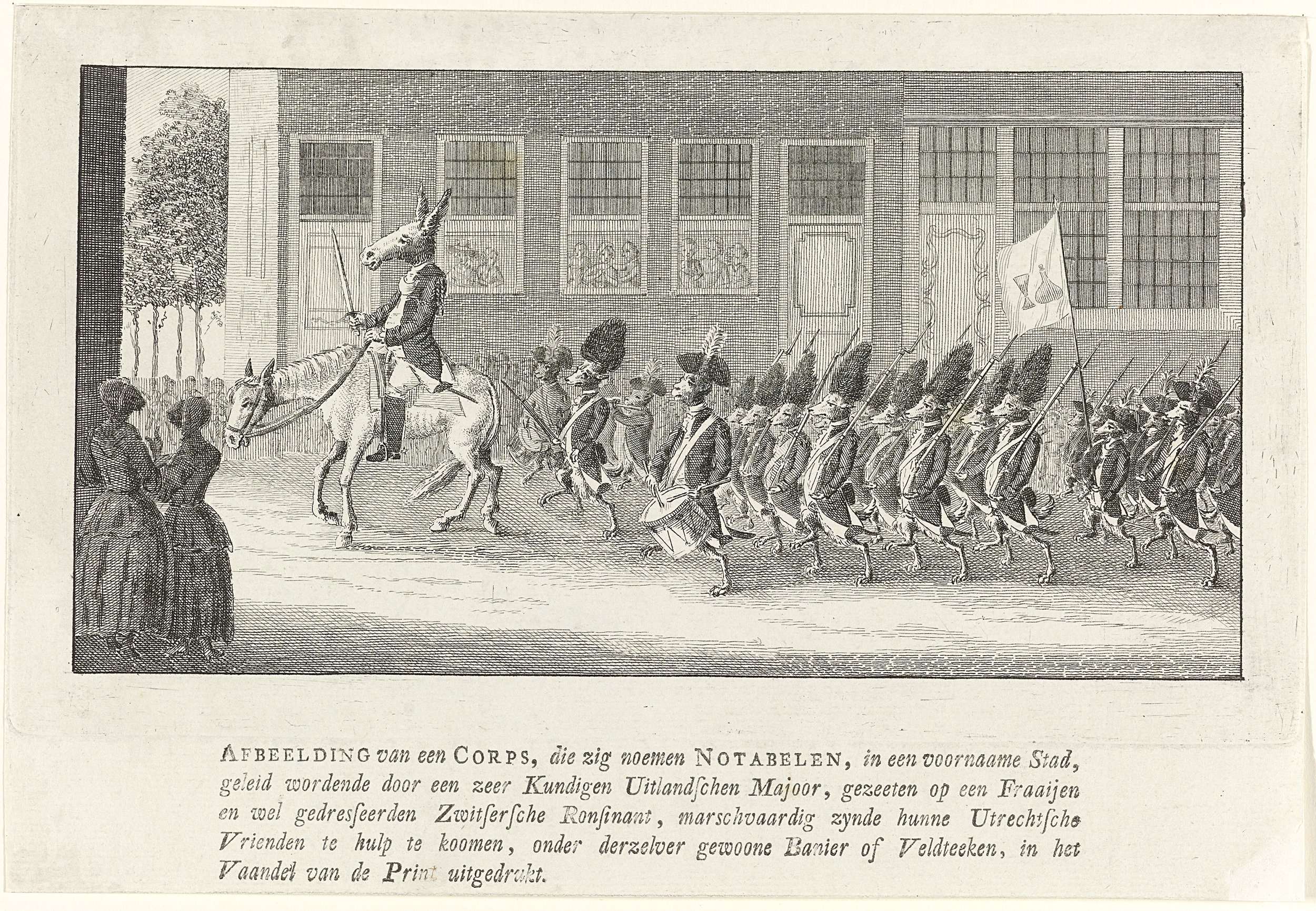 Orangistisch spotprent op het uitrukken van een Rotterdams vrijkorps onder leiding van majoor H. Dufez naar Krimpen aan de Lek, 25 juni 1787. Korps gewapende keeshonden geleid door een aanvoerder met ezelskop. Op het blad onder de plaat een onderschrift van vijf regels.