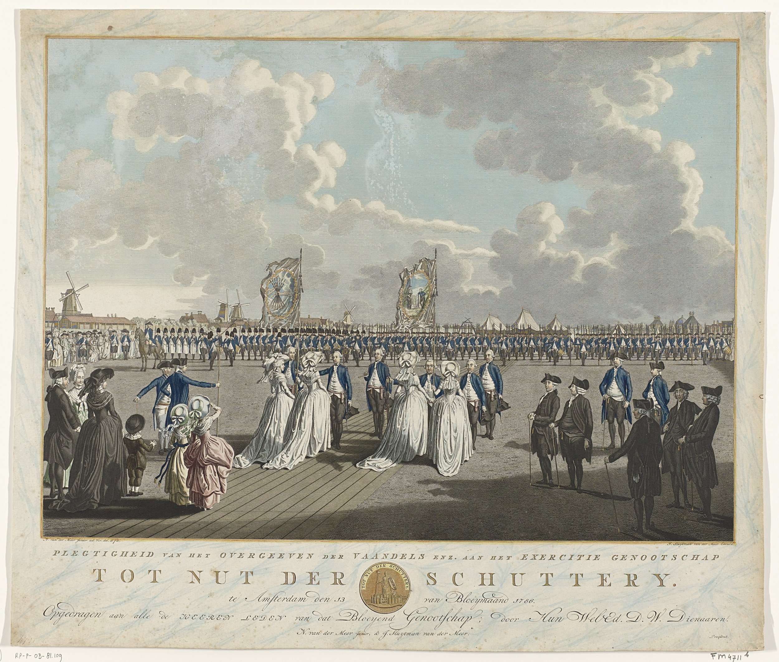 Overdracht van vaandels aan het exercitiegenootschap Tot Nut der Schuttery, 1786