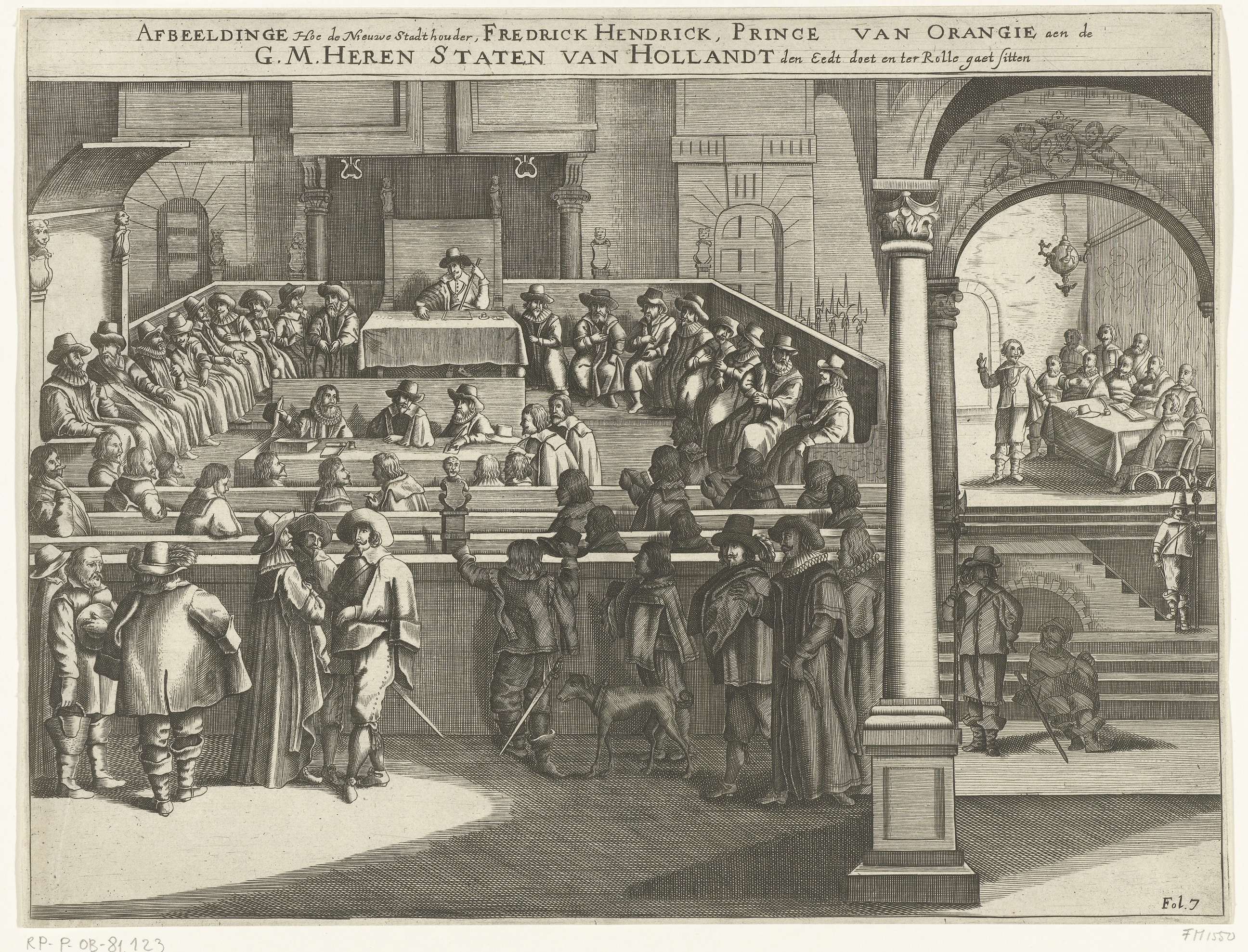 Frederik Hendrik legt de eed af als nieuwe stadhouder en neemt zitting in de Staten van Holland, september 1625. Rechts legt Frederik Hendrik staande de eed af. Links de Staten van Holland bijeen in zitting in aanwezigheid van Frederik Hendrik. Rechtsonder gemerkt: Fol. 7.
