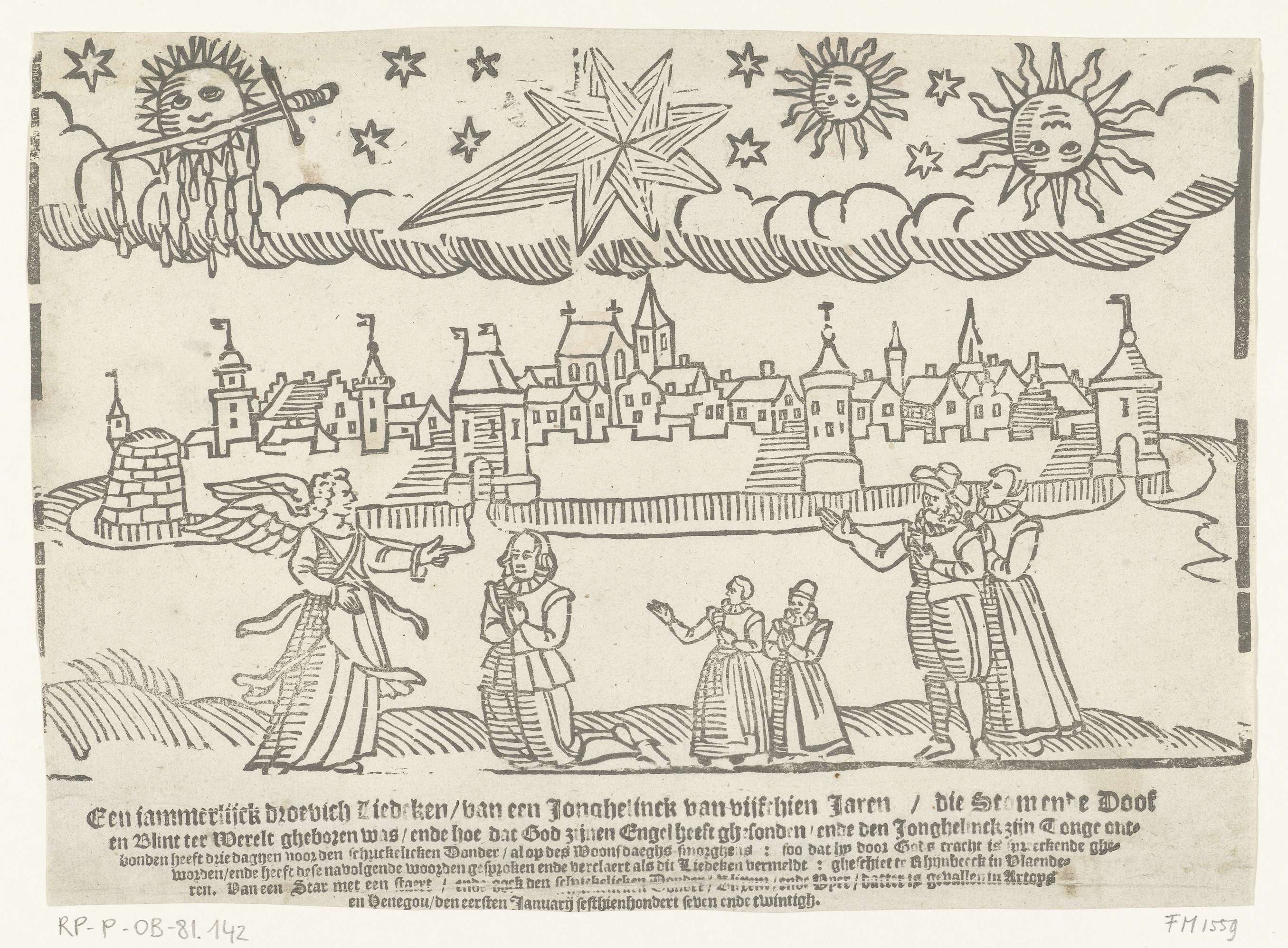 De wonderbaarlijke genezing van een dove en blinde jongen die niet kon spreken, te Rhijnbeeck in Vlaanderen, die zijn spraakvermogen herkreeg drie dagen voor het verschrikkelijke onweer van 1 januari 1627 te Artois en Henegouwen. De jongeman knielend voor een engel met uitgestoken hand, rechts zijn ouders. Op de achtergrond een ommuurde stad met in ...