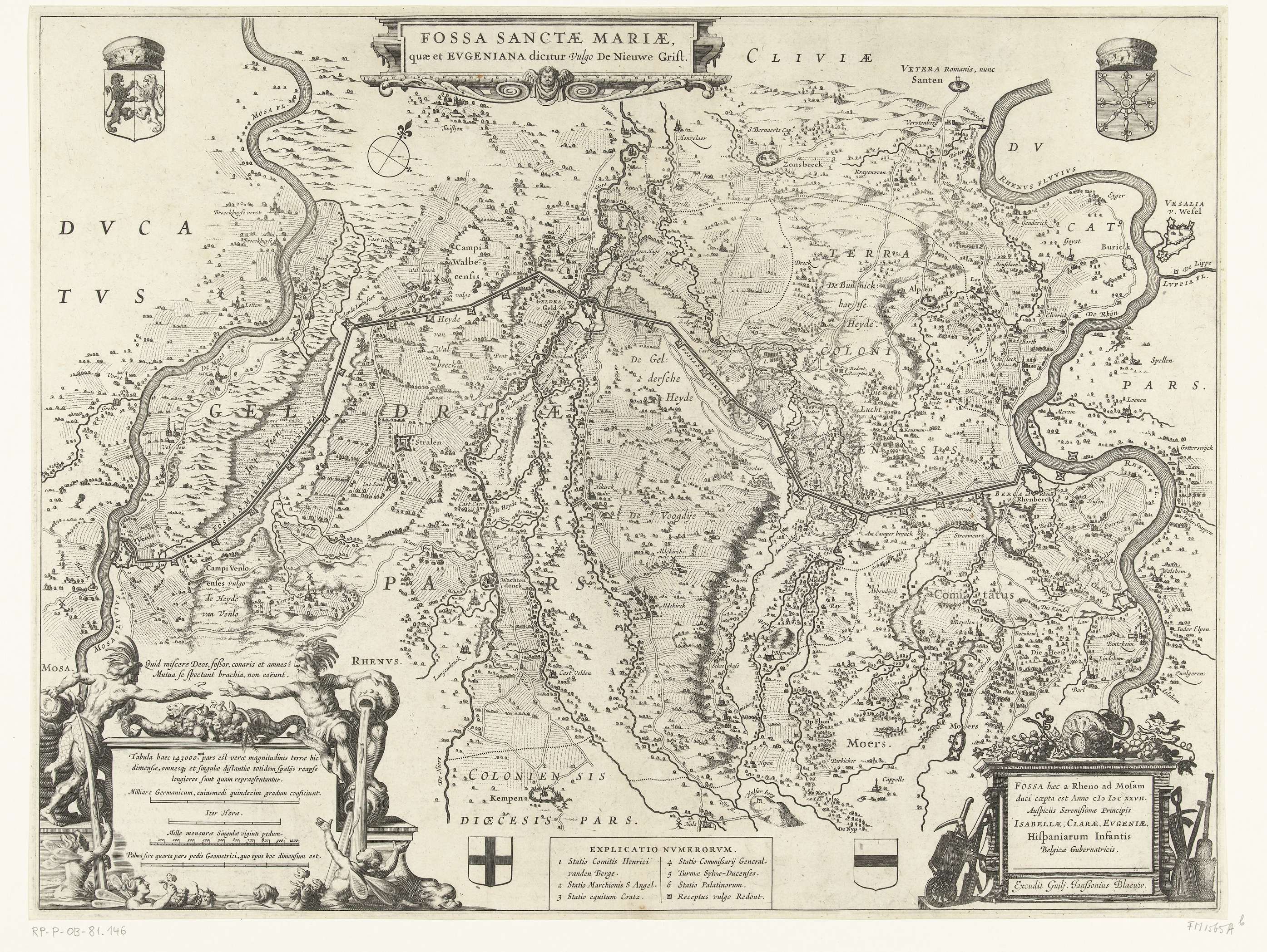 Kaart met het kanaal genaamd Fossa Eugeniana tussen Rijnberg aan de Rijn en Venlo aan de Maas. Boven, in het midden, de titelcartouche. Rechtsonder een cartouche met Latijnse tekst. Onder, in het midden, een kader met legenda 1-6. Linksonder een cartouche met vier schaalstokken, versierd met personificaties van de Rijn en de Maas die elkaar ...