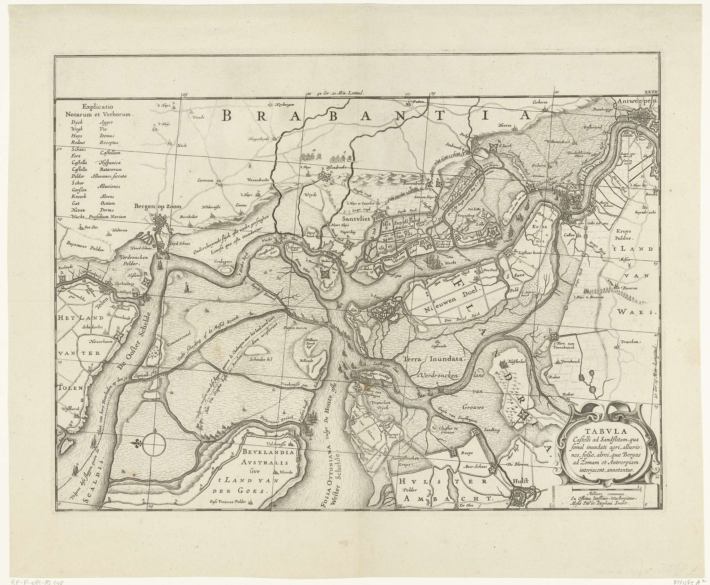 Kaart van forten aan de Ooster- en Westerschelde en rond Zandvliet, 1627. Wellicht in relatie met de aanslag door Spinola op Zuid-Beveland, september 1627. Linksboven de vertaling van termen Nederlands - Latijn. Rechtsonder een cartouche met de titel. Met lijnenraster van lengte- en breedtegraden toegevoegd.