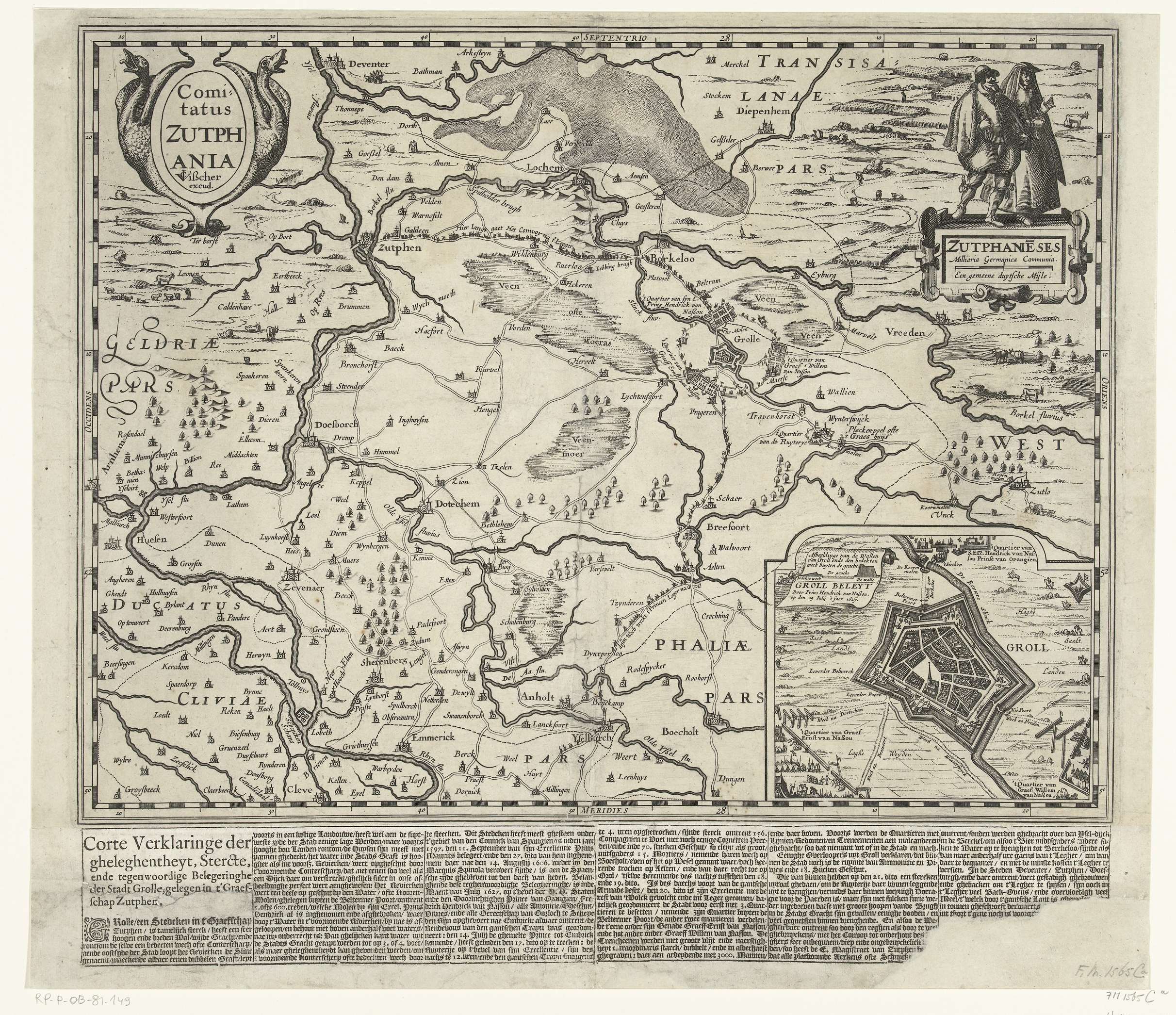 Kaart van graafschap Zutphen, 1627. Rechtsboven twee figuren in regionaal kostuum. Rechtsonder een inzet met een plattegrond van Groenlo belegerd door het Staatse leger onder Frederik Hendrik in 1627. Vastgeplakt onder de prent een tekst (incompleet) met de beschrijving van het beleg van Grol in 6 kolommen in het Nederlands.