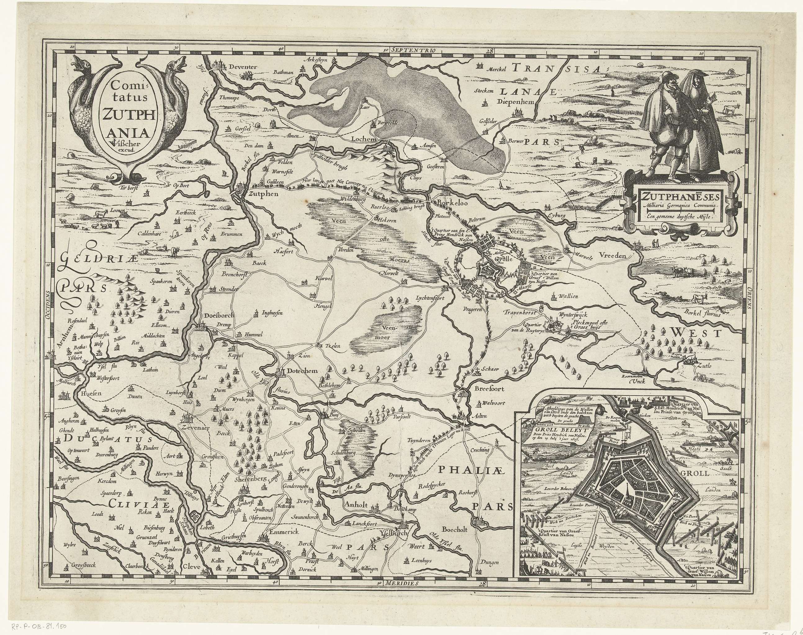 Kaart van graafschap Zutphen, 1627. Rechtsboven twee figuren in regionaal kostuum. Rechtsonder een inzet met een plattegrond van Groenlo belegerd door het Staatse leger onder Frederik Hendrik in 1627. Zonder de tekst onder de prent.