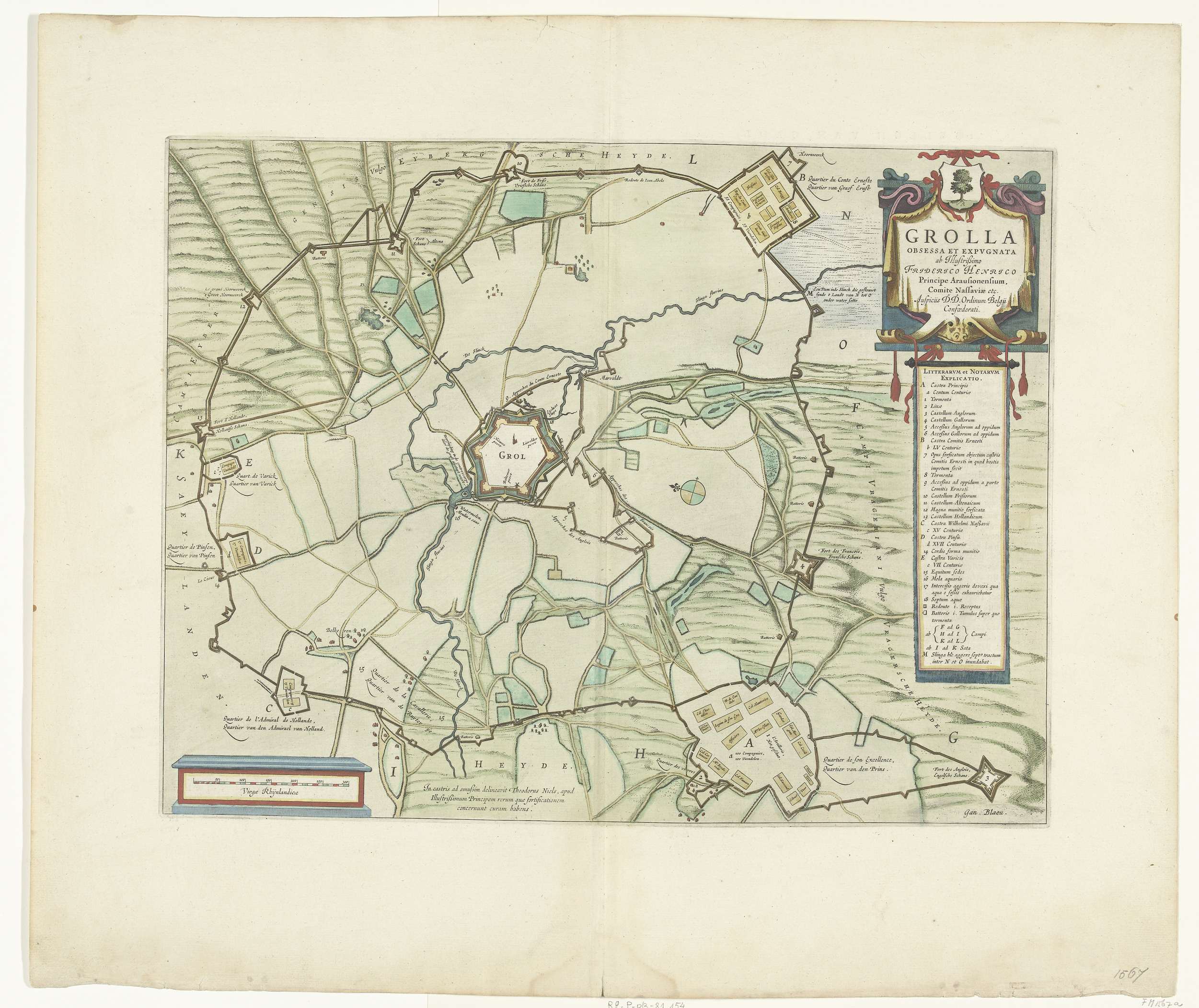 Kaart van het beleg van Groenlo, 1627. Centraal de stad Groenlo, daaromheen de kwartieren van de belegerende troepen. Rechtsboven een cartouche met de titel en de legenda A-O en 1-18 in het Latijn. Opschriften in de voorstellingen in het Frans en Nederlands. Op een dubbelblad genomen uit het Stedenboek van Blaeu, bedrukt op achterzijde met ...