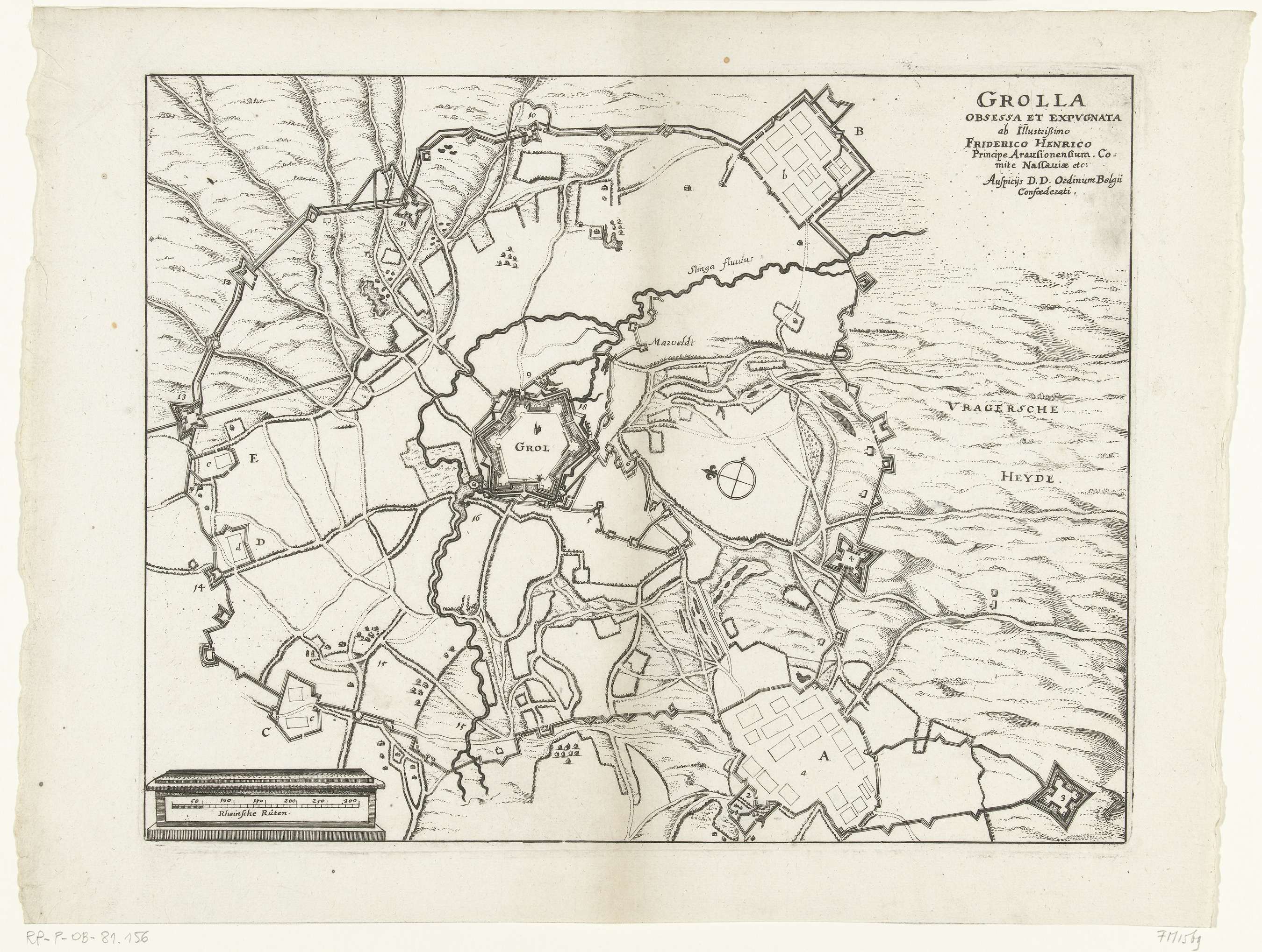 Kaart van het beleg van Groenlo, 1627. Centraal de stad Groenlo, daaromheen de kwartieren van de belegerende troepen.