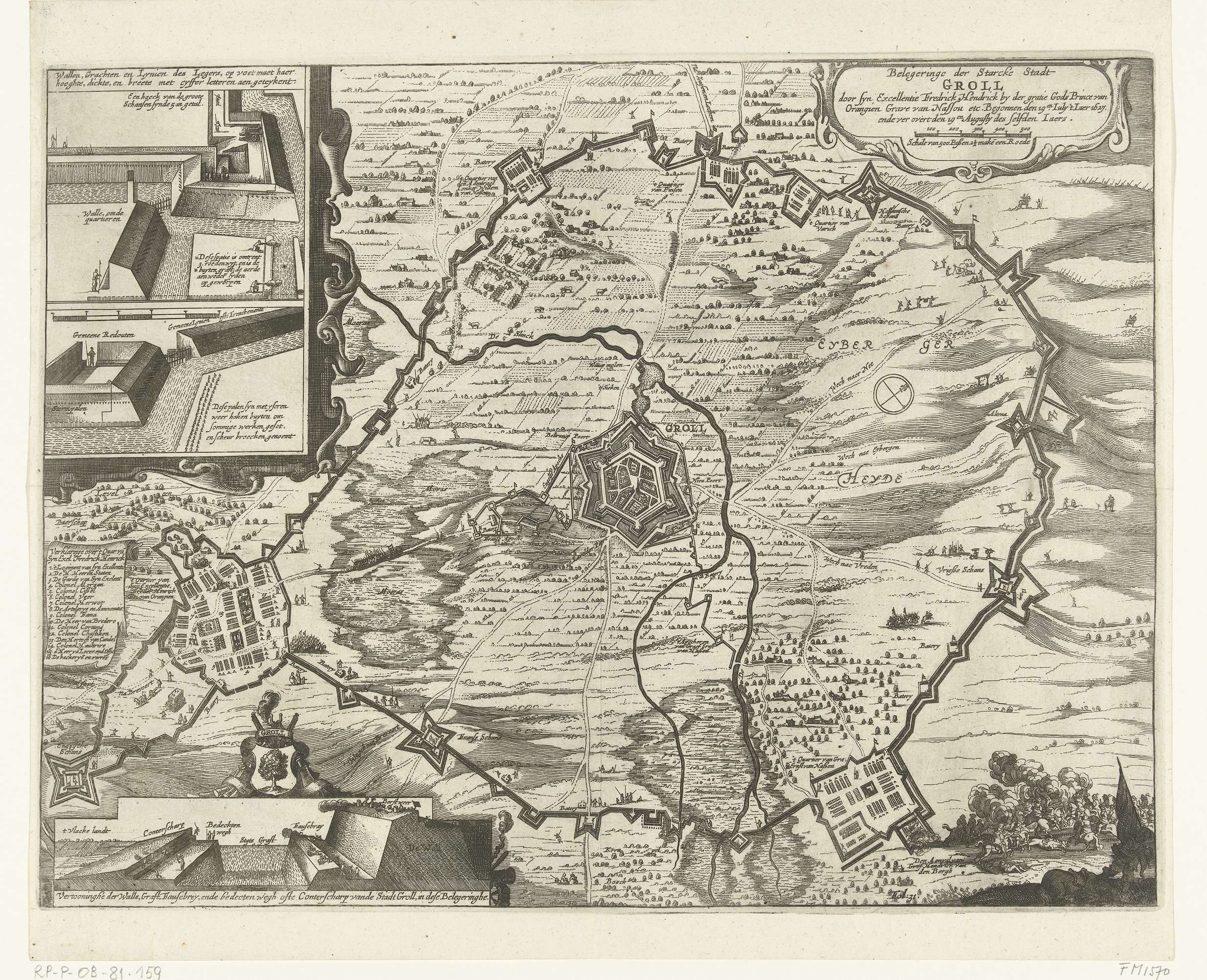 Beleg en verovering van de stad Groenlo (Grol) door het Staatse leger onder Frederik Hendrik, 6 juli - 19 augustus 1627. Centraal de stad met het omliggende land en de kwartieren van de belegeraars. Linksboven een inzet met twee details van de wallen en redoutes aangelegd door het leger. Daaronder de legenda 1-16 van het ...