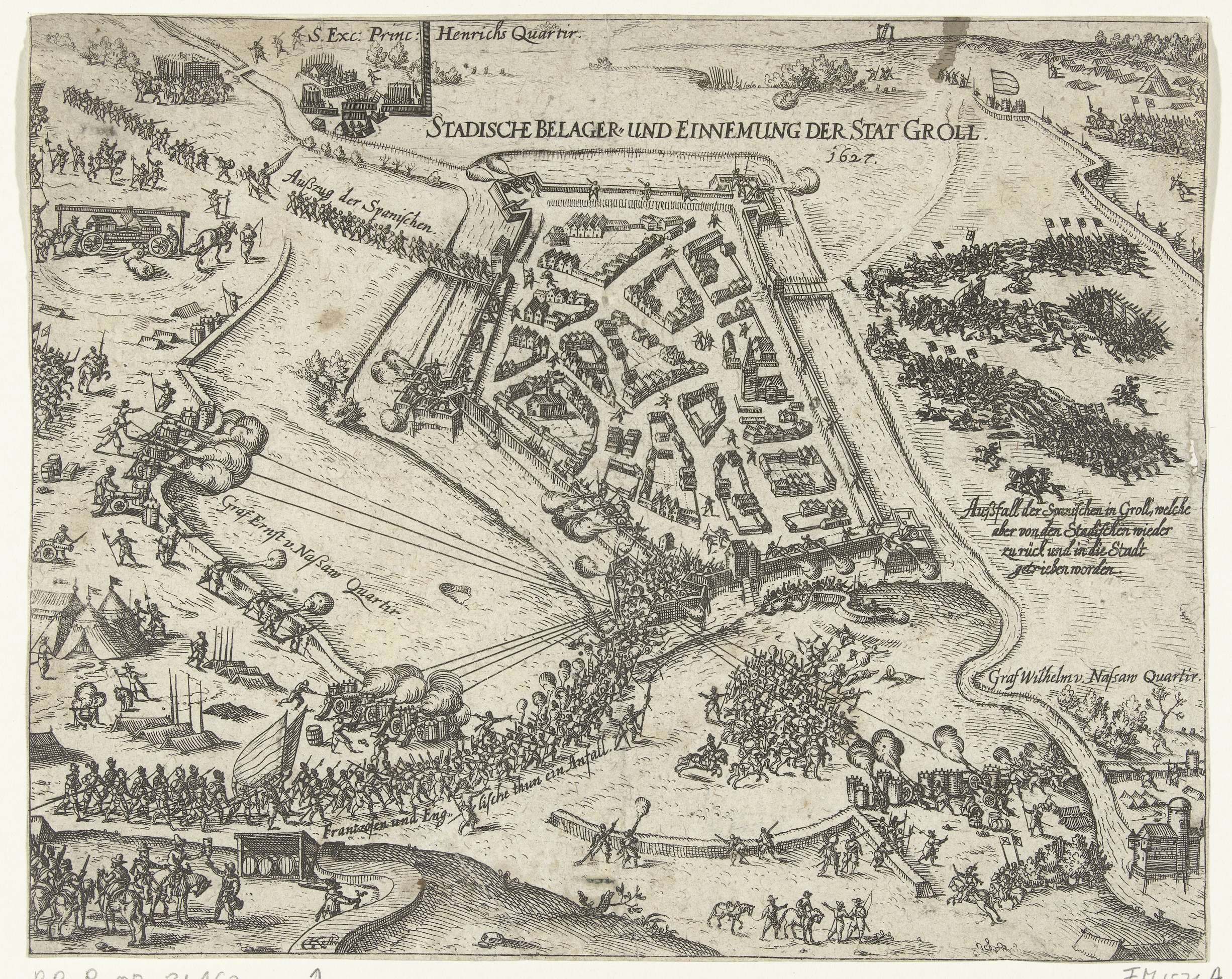 Beleg en verovering van de stad Groenlo (Grol) door het Staatse leger onder Frederik Hendrik, 6 juli - 19 augustus 1627. Onderaan links een aanval van Franse en Engelse soldaten op de stad, rechts doen de Spanjaarden een uitval. Linksboven verlaten de Spaanse troepen de stad.