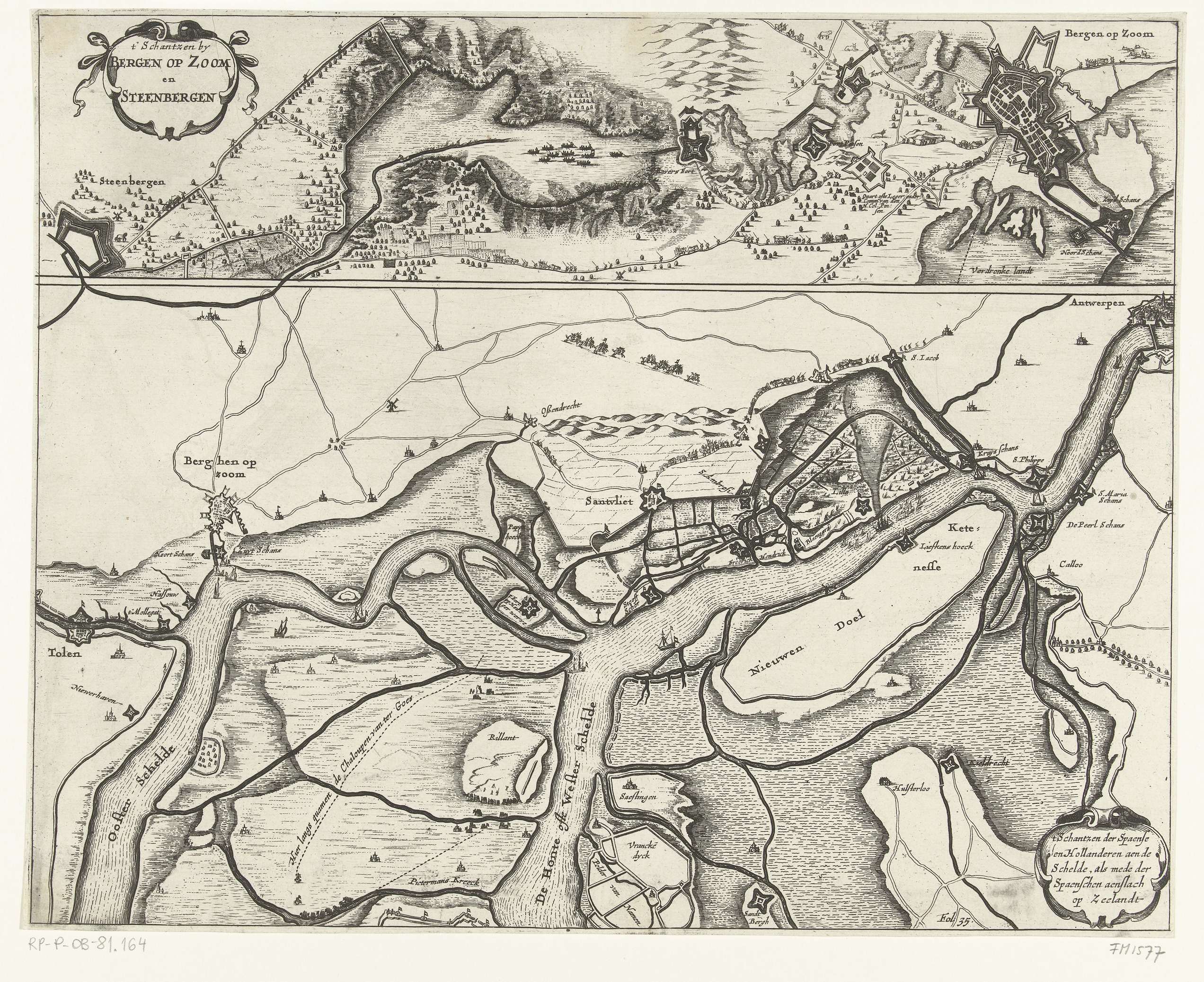 Blad met twee voorstellingen. Boven de schansen bij het mislukte beleg van Bergen op Zoom door het Spaanse leger onder Spinola en Velasco, 18 juli - 3 oktober 1622. Onder een kaart van het rivieren- en krekengebied tussen de Ooster- en Westerschelde met de bouw van Hollandse en Spaanse schansen aan de Schelde in 1627, ...