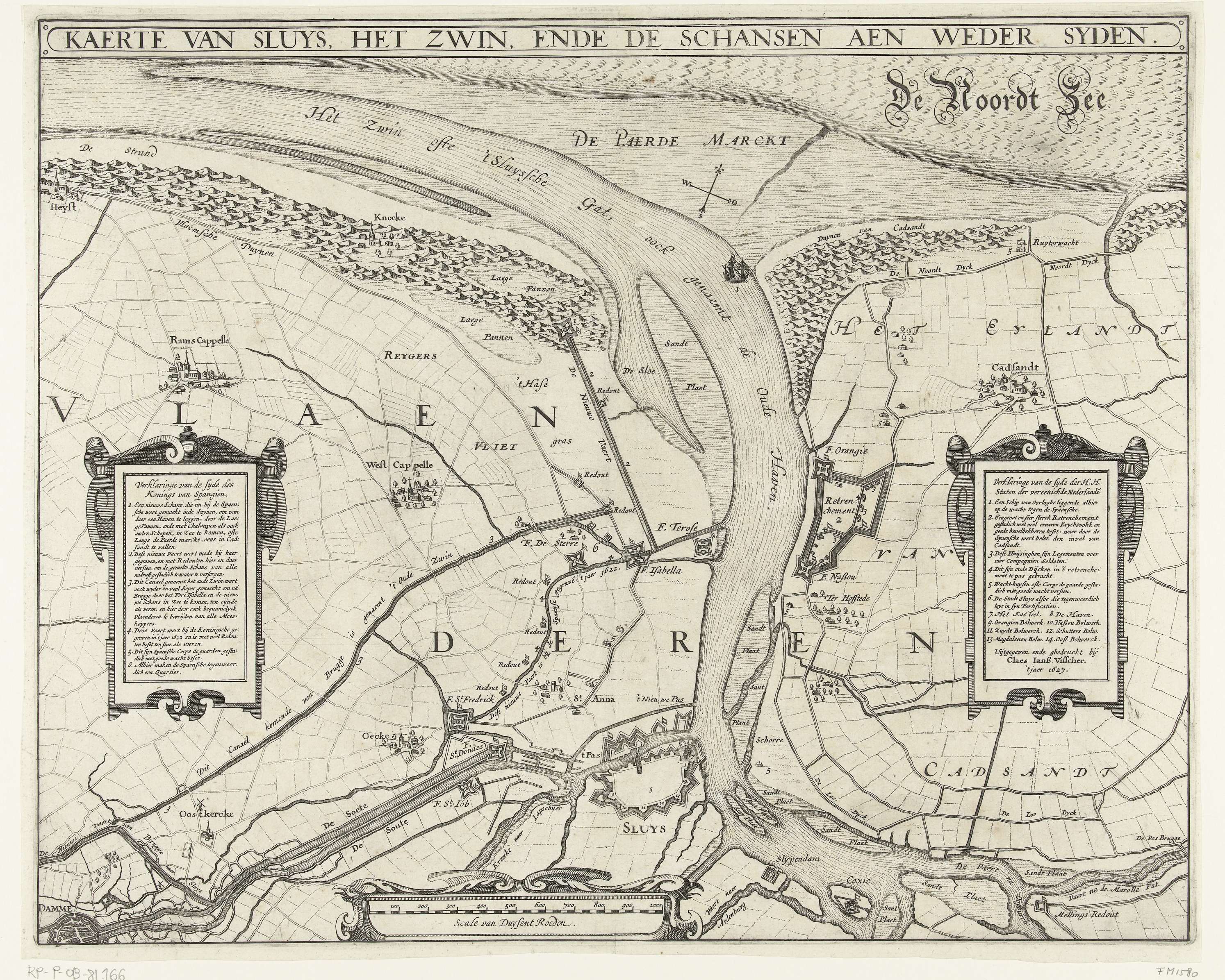 Kaart van de stad Sluis met het Zwin, het omliggende land tussen Cadzand, Damme en Ramskapelle; met de schansen aan Spaanse en Staatse zijde, 1627. Links en rechts cartouches met de legenda's 1-6 en 1-13 in het Nederlands. Onder, links van het midden, een schaalstok: Scale van Duysent Roeden.
