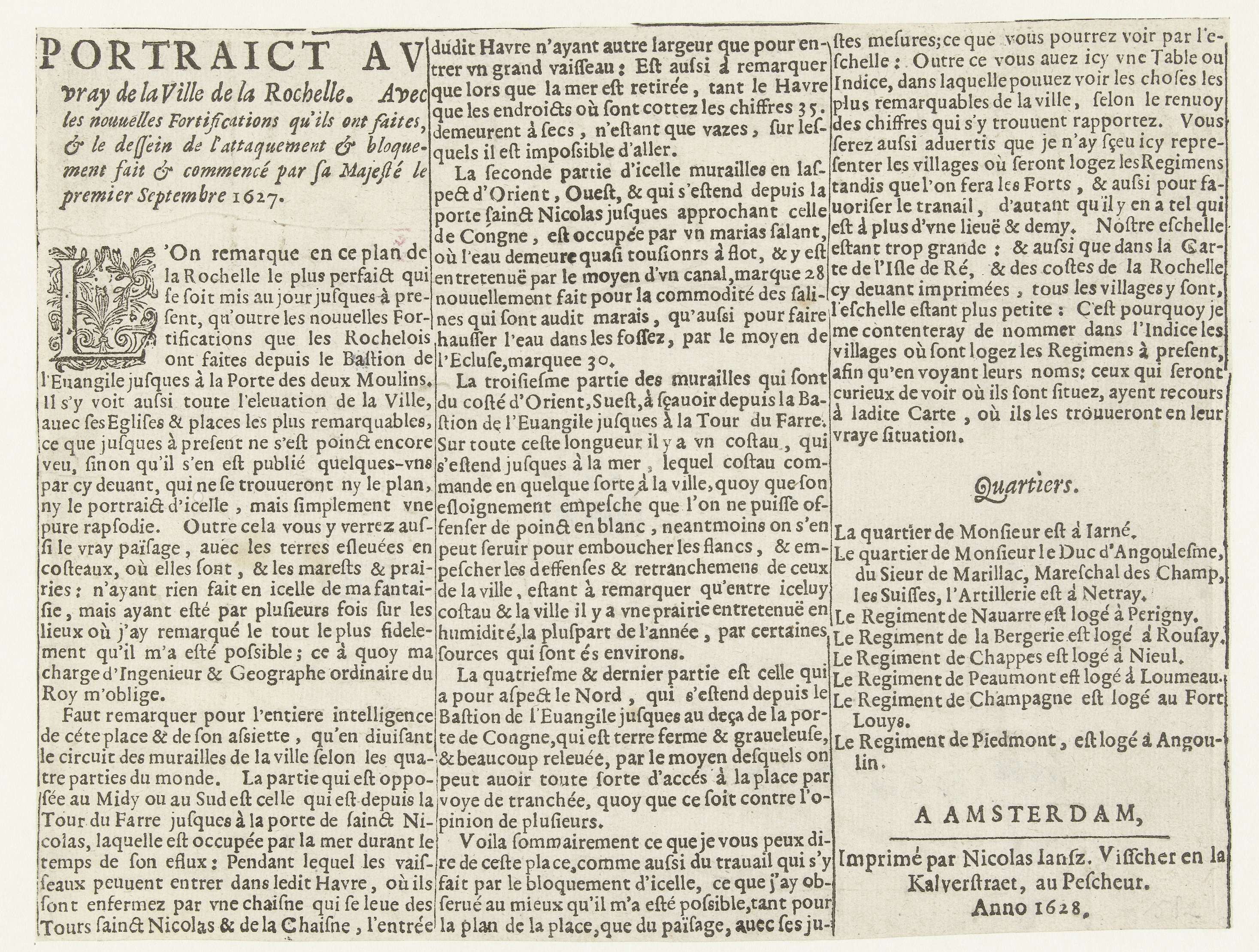 Tekstblad bij de prent van de kaart van de Franse kust met het beleg van La Rochelle door het Staatse leger en Frankrijk, september 1627 - oktober 1628. Omsingeling van de opstandige stad door de Franse koninklijke troepen onder kardinaal Richelieu. Blad met tekst in 3 kolommen in het Frans.