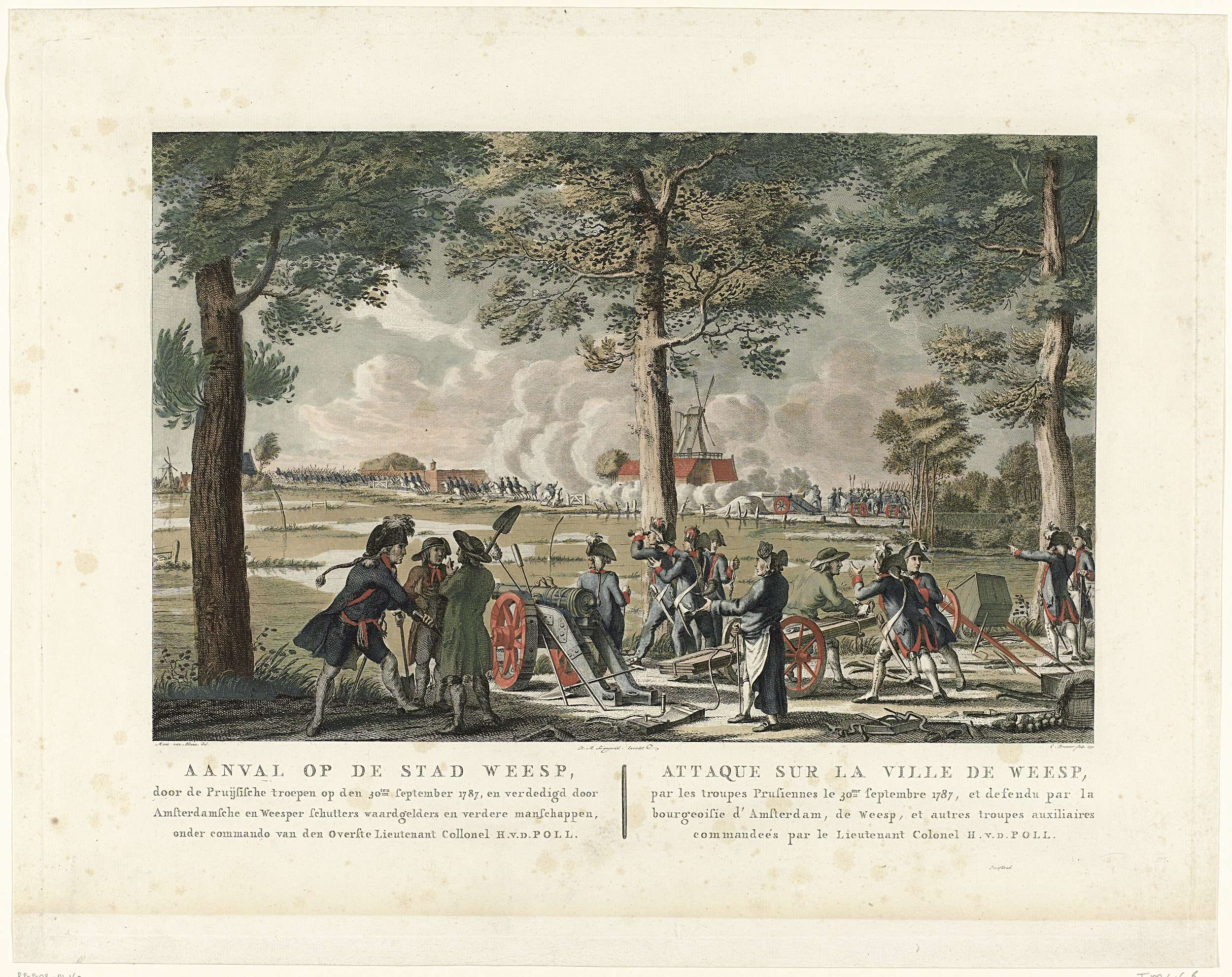 Aanval op Weesp door de Pruisische troepen op 30 september 1787. De stad wordt verdedigt door de Amsterdamse en Weesper schutters onder commando van kolonel H. v.d. Poll. Op de voorgrond de patriotten, in de verte de Pruisische troepen. Onderdeel van een groep van zeven prenten van de gevechten met de Pruissische troepen rond Amsterdam ...