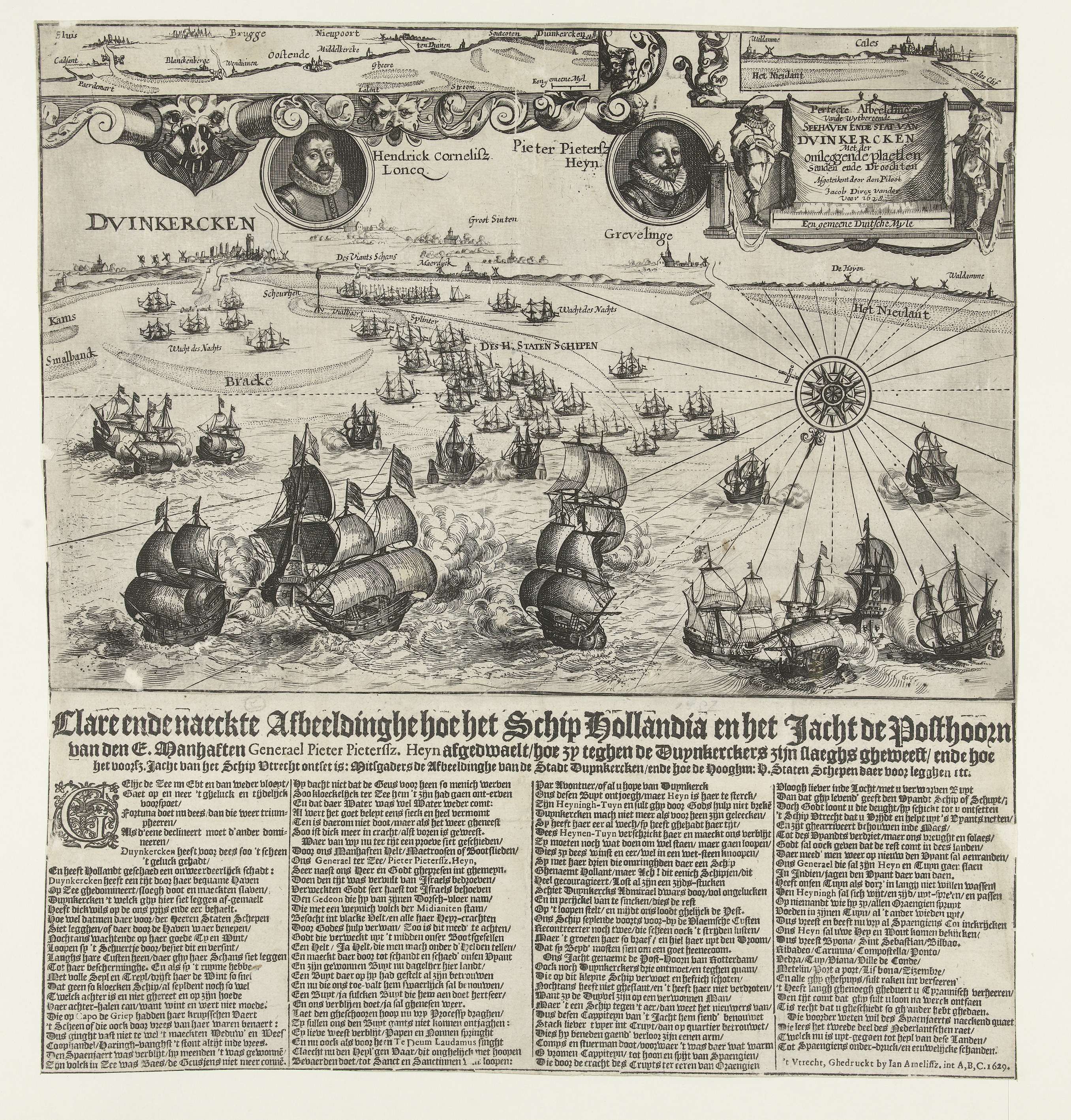 Het Noord-Franse en Vlaamse kustgebied tussen Duinkerken en Grevelingen met schepen van de Staatse vloot onder Piet Hein, waaronder de Hollandia, de Utrecht en de Posthoorn, in schermutseling met zeerovers afkomstig uit Duinkerken, 1628. Op de voorgrond een gevecht tussen enkele oorlogsschepen. Bovenaan twee inzetten met detailkaarten en portretten van Hendrick Cornelisz. Loncq en Piet ...