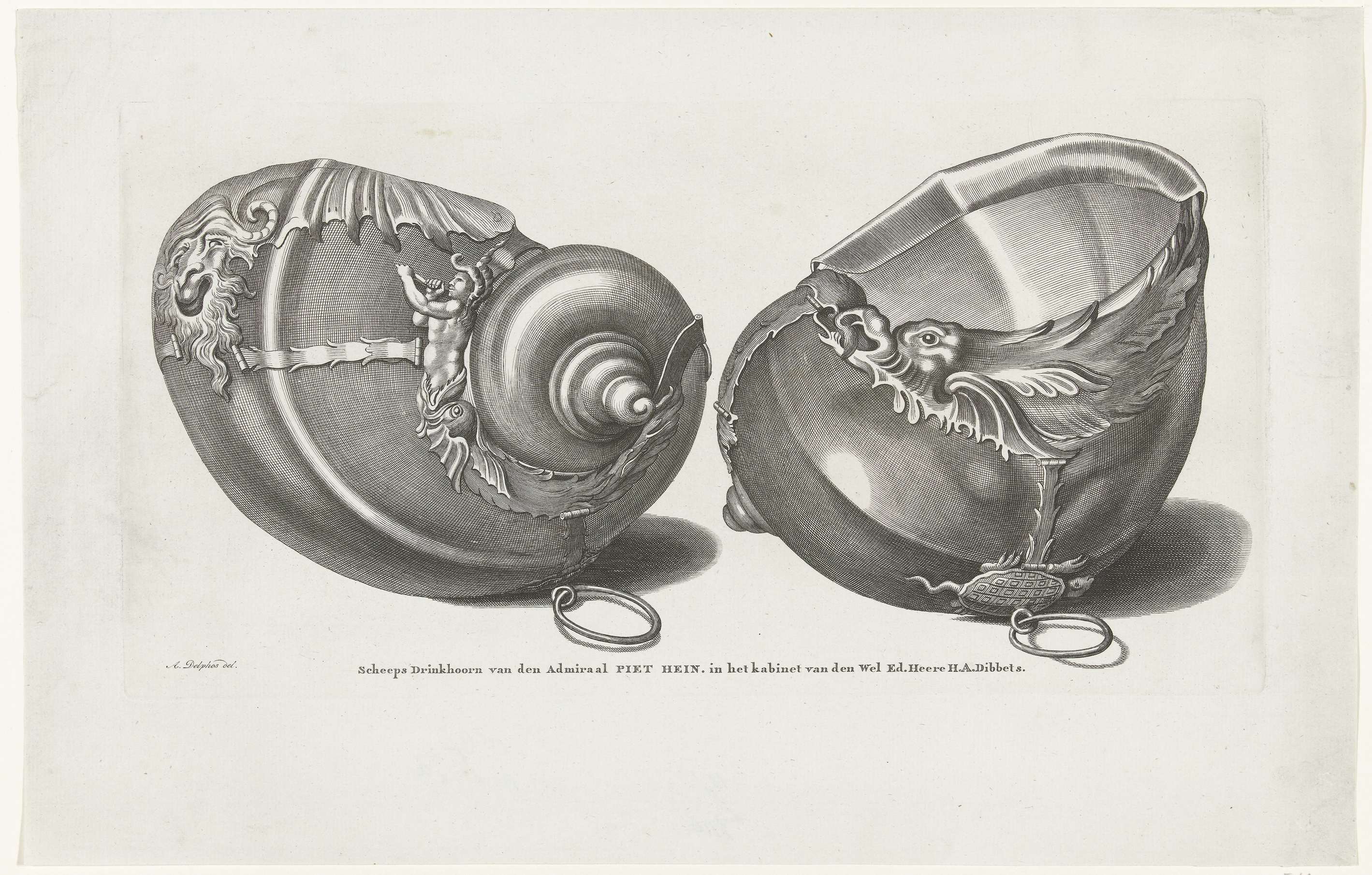De scheepsdrinkhoorn van Piet Hein in het kabinet van H.A. Dibbets. Een met zilver beslagen schelp, met zeewezens en ornamenten, gezien van twee zijden.