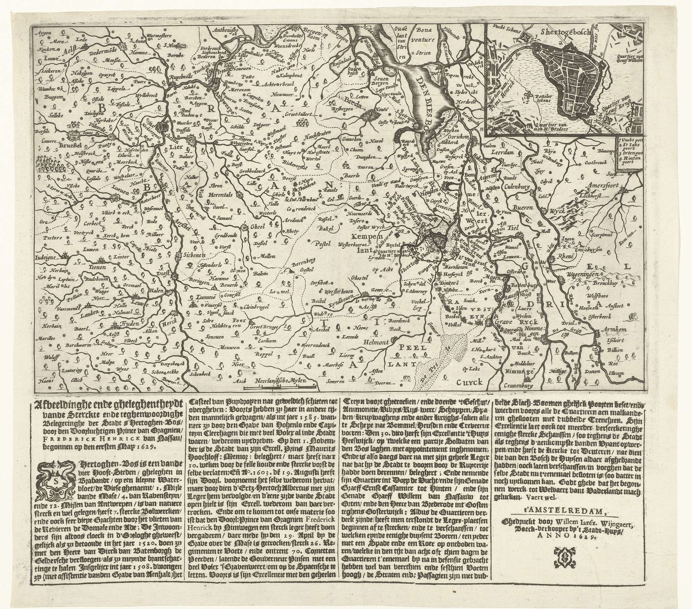 Kaart van een groot deel van Noord-Brabant van Antwerpen tot Nijmegen met het beleg van Den Bosch door het Staatse leger onder Frederik Hendrik, van 1 mei tot 17 september 1629. Rechtsboven een inzet met een plattegrond van de stad. Gedrukt onder de plaat 4 kolommen tekst in het Nederlands.