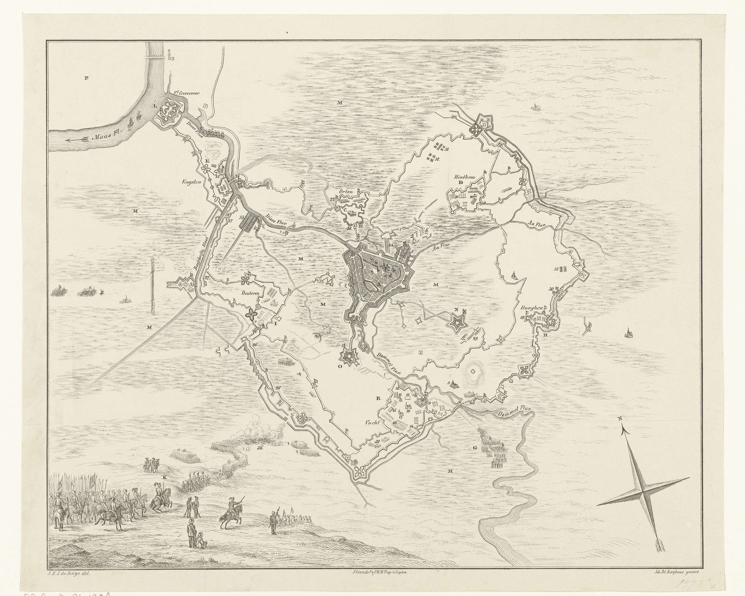 Kaart van Den Bosch en omgeving tijdens de omsingeling en het beleg door het Staatse leger onder Frederik Hendrik, van 1 mei tot 17 september 1629.