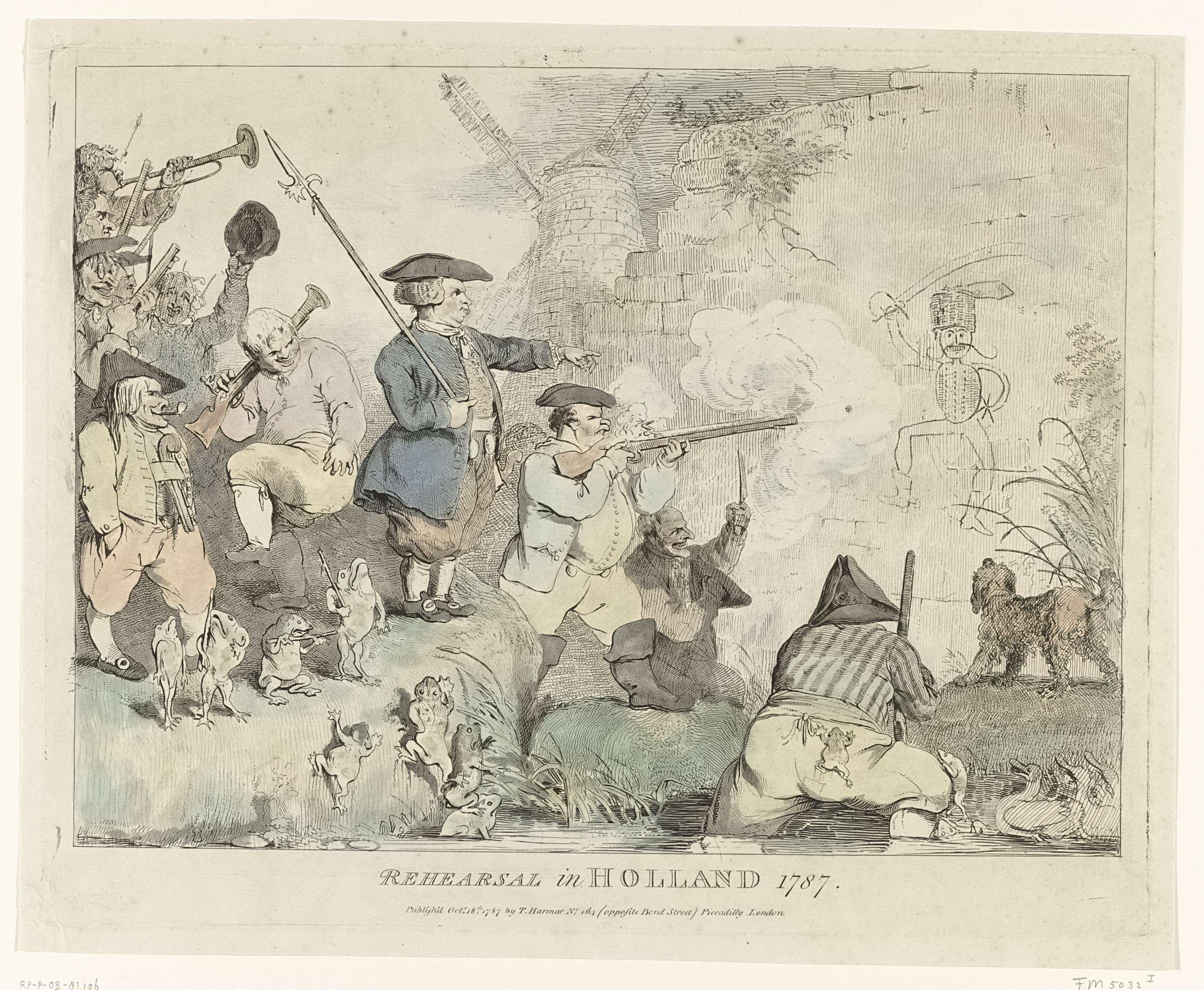 Hollandse patriotse schutters oefenen met het schieten op een figuur van een boze Pruisische huzaar die op een muur is getekend, tot hilariteit van de betrokkenen en toeschouwers. Kikkers kruipen uit de sloot en doen mee met exerceren. Onderdeel van een groep van vier spotprenten op de patriotten ten tijde van de Pruisische inval in ...