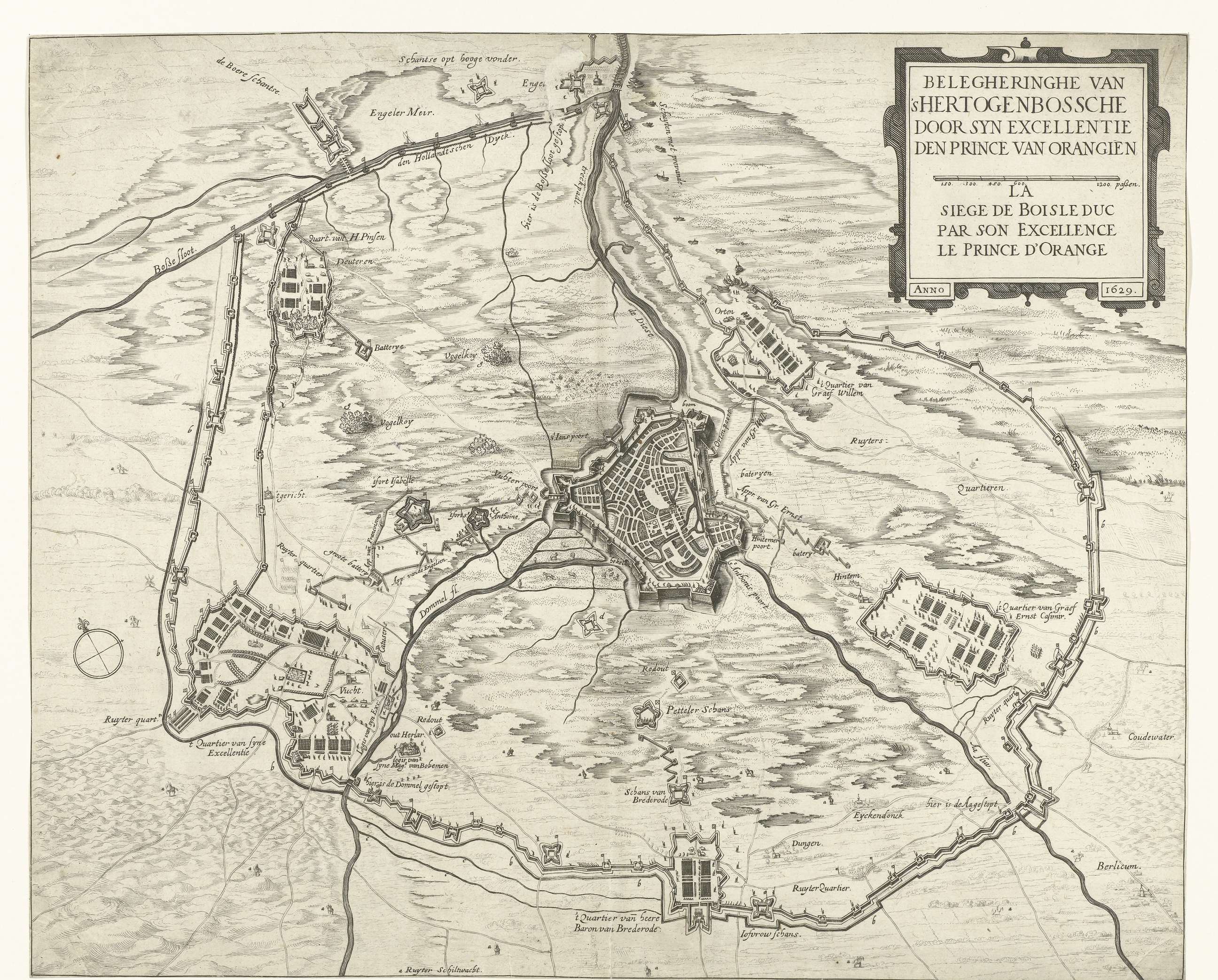 Kaart van Den Bosch en omgeving tijdens de omsingeling en het beleg door het Staatse leger onder Frederik Hendrik, van 1 mei tot 17 september 1629. Met de vijf legerkampen van de belegerende legers. Rechtsboven een cartouche met de titels.