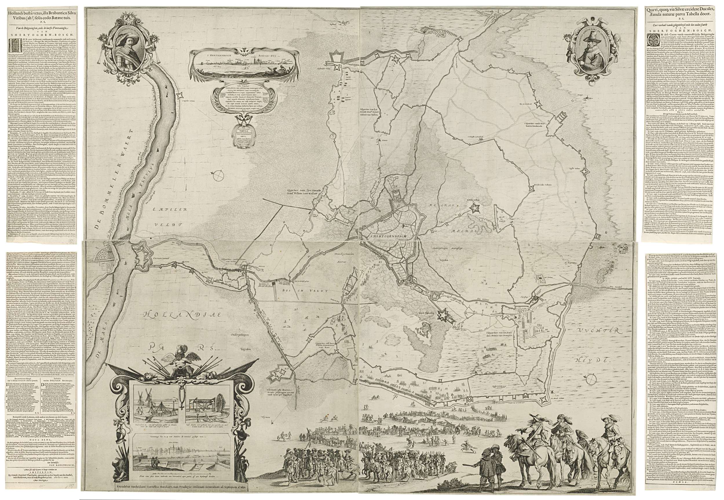 Grote kaart van de omsingeling van Den Bosch tijdens het beleg door het Staatse leger onder Frederik Hendrik, van 1 mei tot 17 september 1629. Geheel bestaande uit 4 platen en 4 tekstbladen.