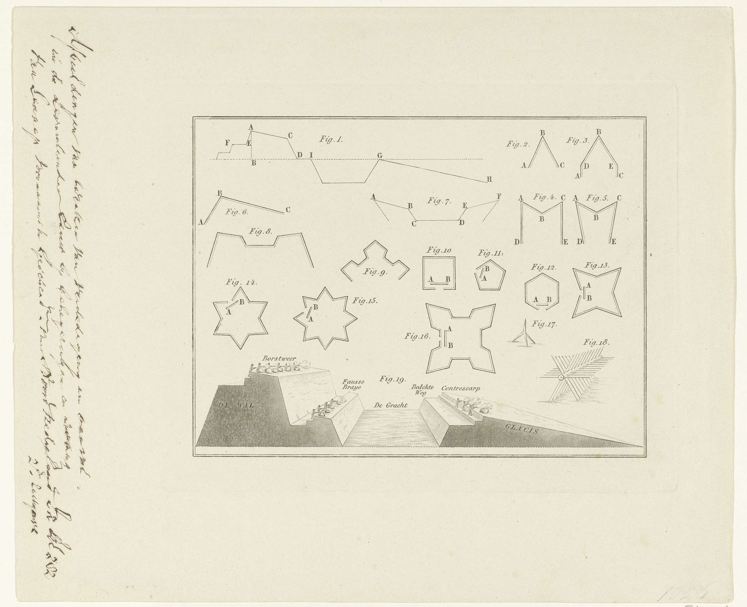 Verdedigings- en aanvalswerken in gebruik in de zeventiende eeuw, bijvoorbeeld bij het beleg van Den Bosch door het Staatse leger onder Frederik Hendrik, van 1 mei tot 17 september 1629. Verschillende figuren genummerd 1-19.