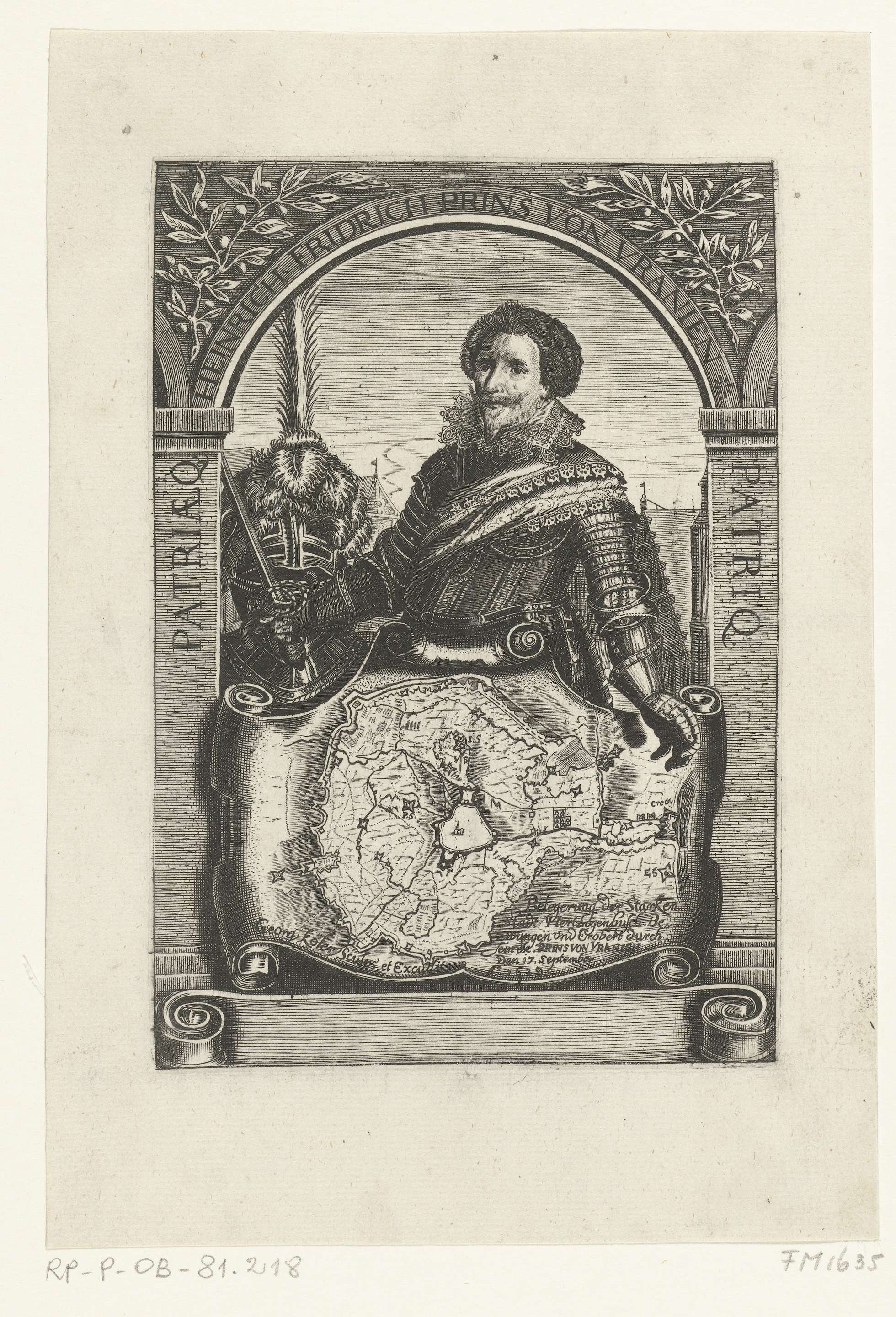 Portret van Frederik Hendrik met een kaart van het beleg van Den Bosch in 1629