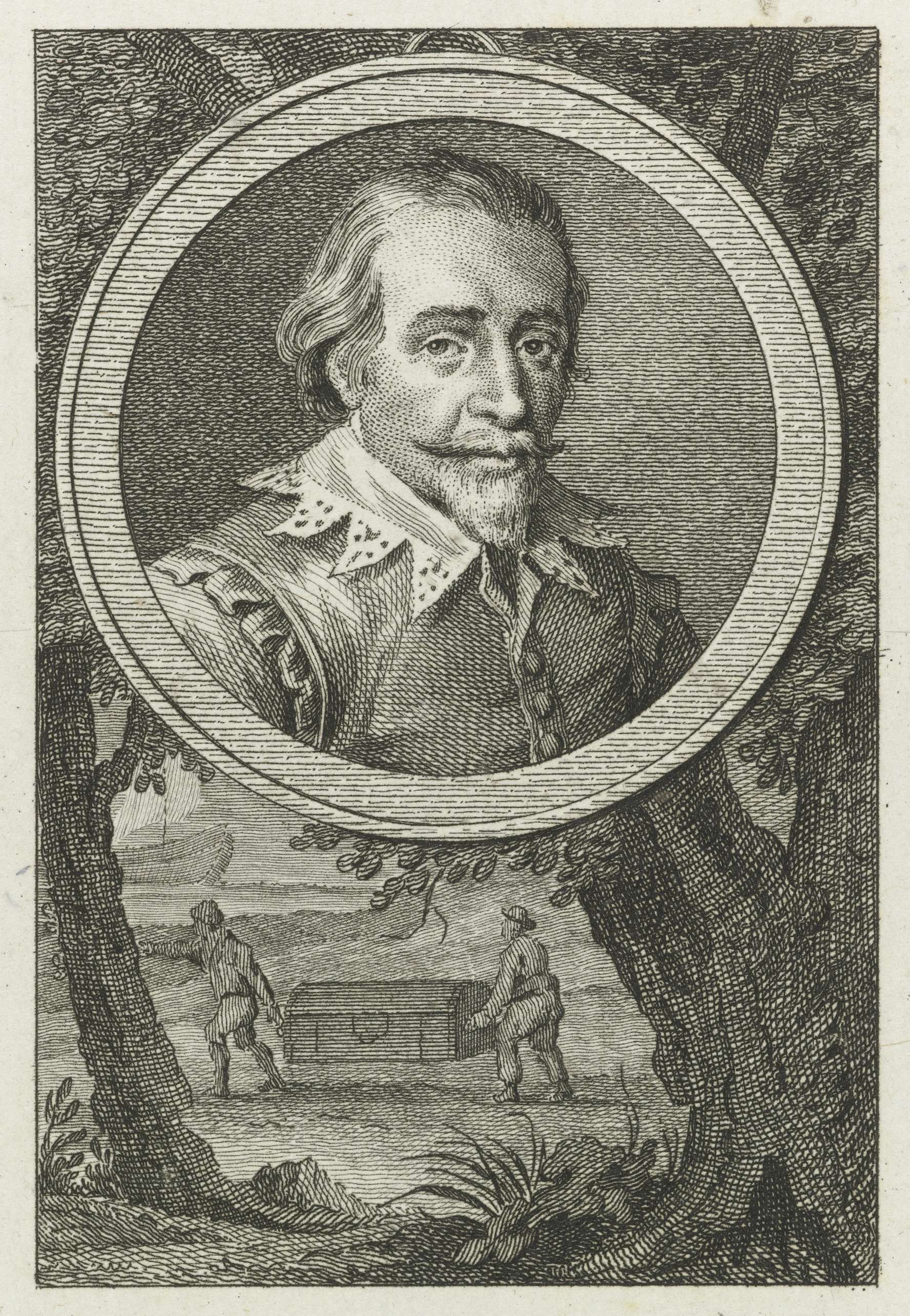 Rond portret van Willem van Oldenbarnevelt, op de achtergrond dragen twee mannen een kist,