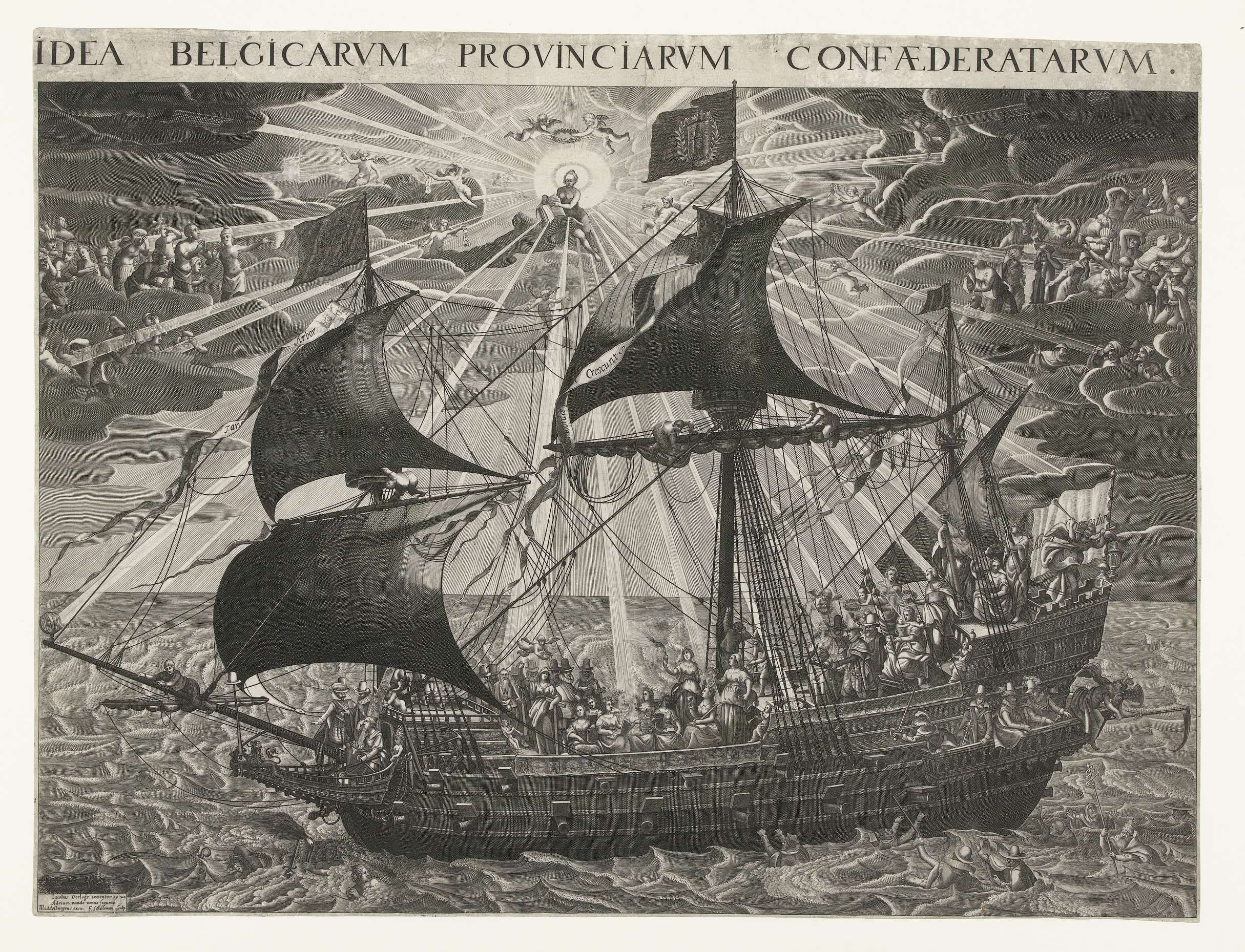 Het Schip van Staat. Allegorie op de gelukkige staat van het land na de synode van Dordrecht, 1620. Het Schip van Staat vaart in rustig water, met aan boord de zeven provinciemaagden en personificaties van deugden. Prins Maurits en Justitia staan aan het roer. In het water spartelen de katholieken en personificaties van ondeugden. In ...