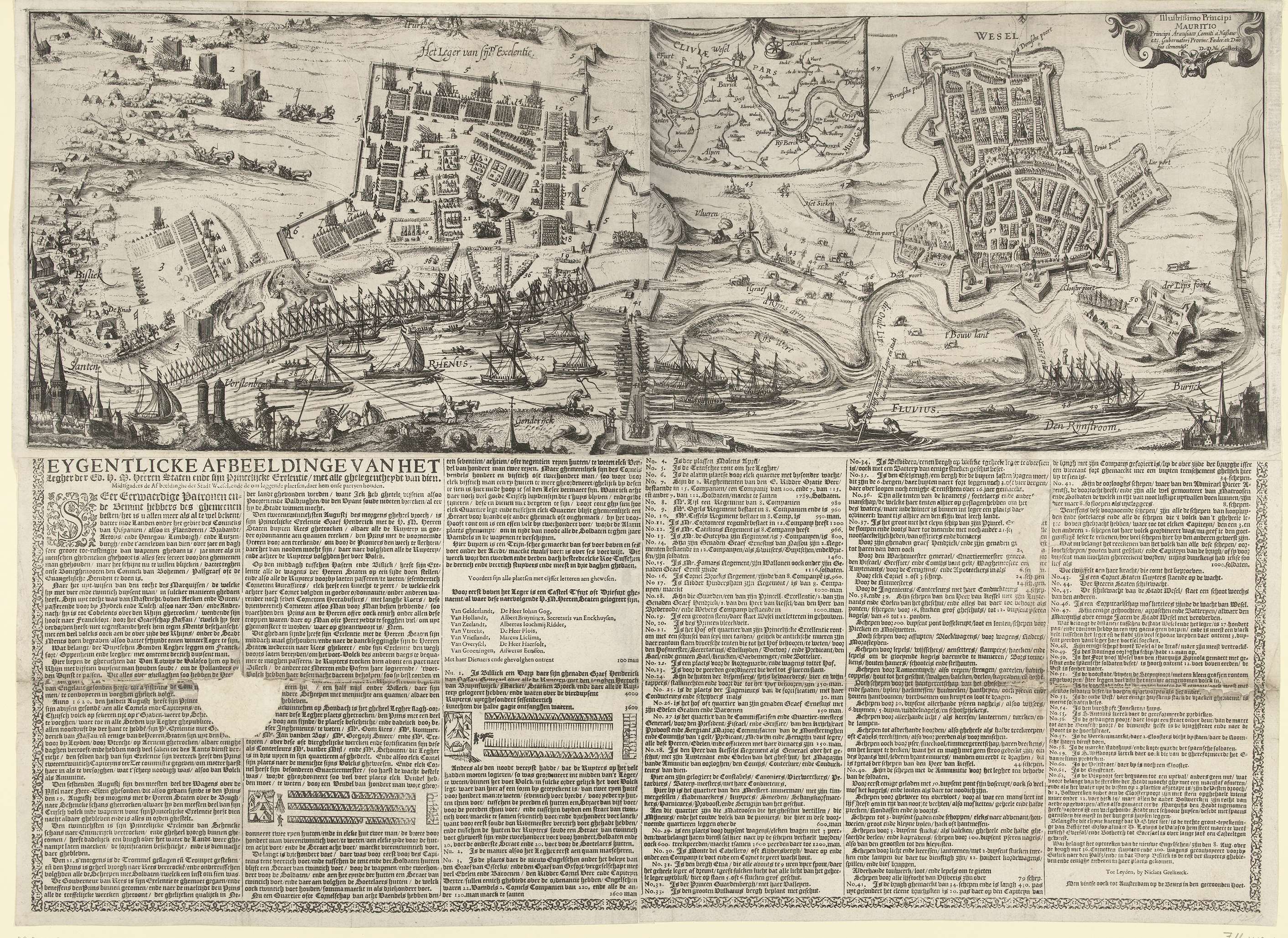 Groot blad met de tocht van prins Maurits naar Wesel tegen Spinola, 15 augustus 1620. Onderaan de rivier de Rijn met schepen van de Staatse vloot, links het legerkamp van prins Maurits, rechts de stad Wesel. Hiertussen een kaartje van het land van Kleef. De voorstelling gedrukt van twee platen, hieronder vastgeplakt twee tekstbladen met ...