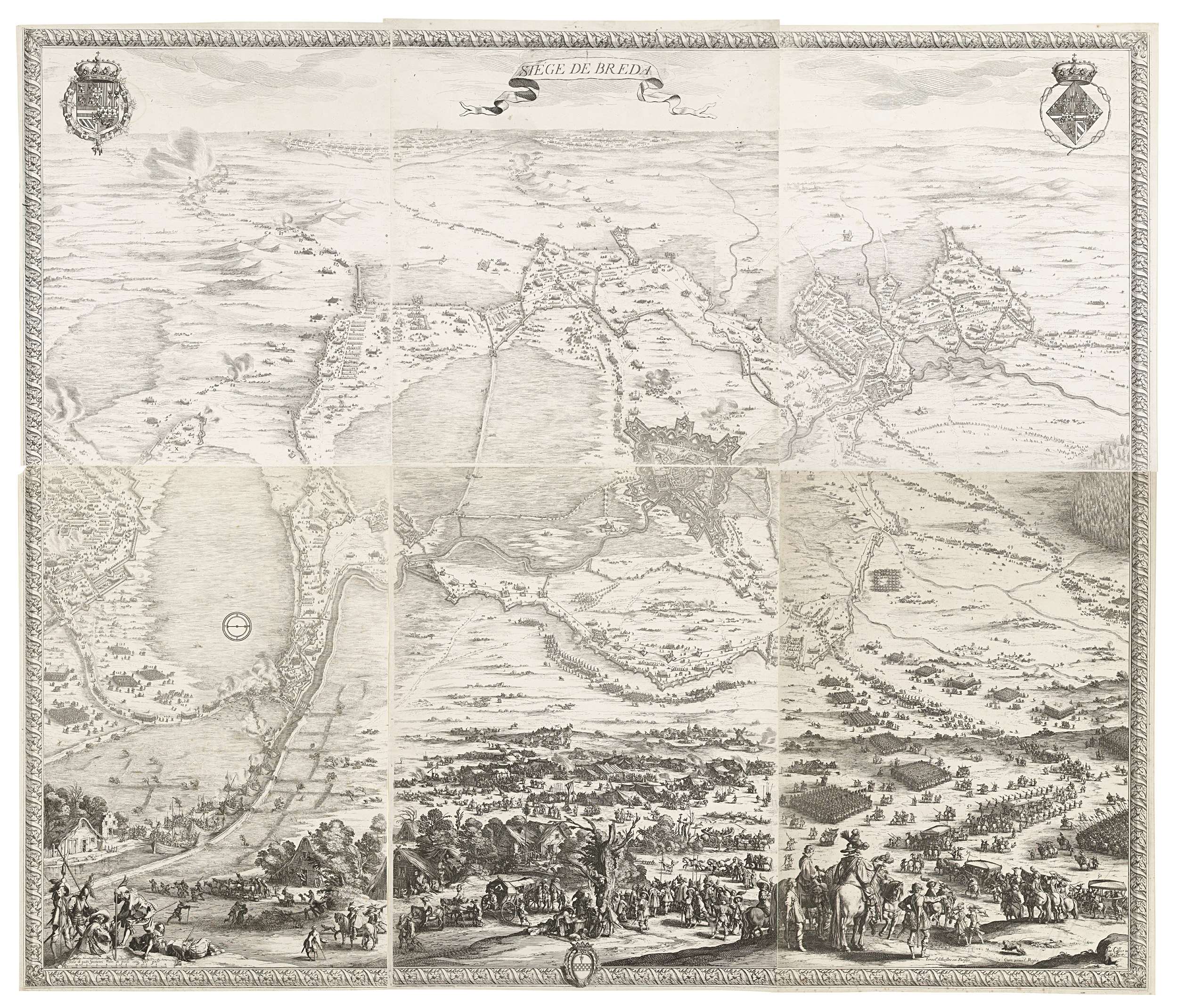 Grote voorstelling in zes bladen van het beleg van de stad Breda in de jaren 1624 en 1625 door de Spanjaarden onder aanvoering van Ambrogio Spinola. Centraal staat een plattegrond van de belegerde stad, omgeven door belegeringswerken en kampementen. Op het middenplan, recht onder Breda, een tentenkamp. Op het middenplan en de voorgrond rechts het ...