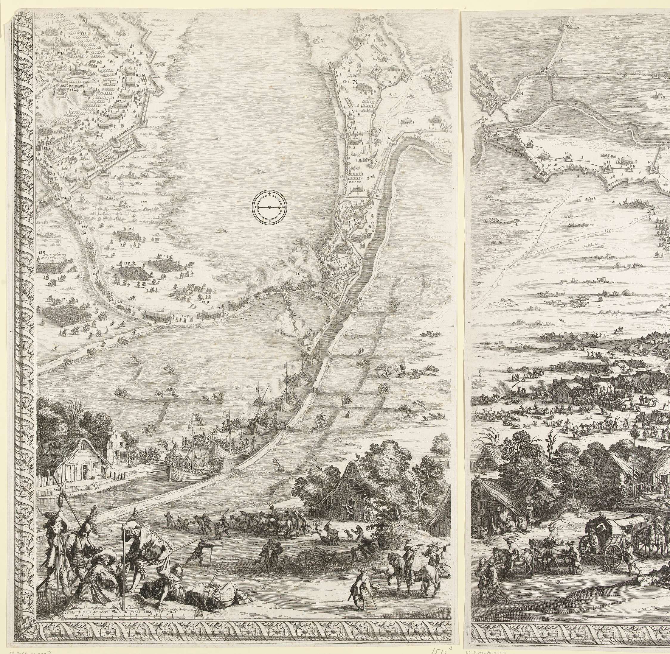 Grote voorstelling in zes bladen van het beleg van de stad Breda in de jaren 1624 en 1625 door de Spanjaarden onder aanvoering van Ambrogio Spinola. Blad linksonder. Op dit blad een deel van de belegeringswerken en kampementen om Breda. Voorts op de voorgrond een (deel van een) dorpje dat door soldaten geplunderd wordt, en ...