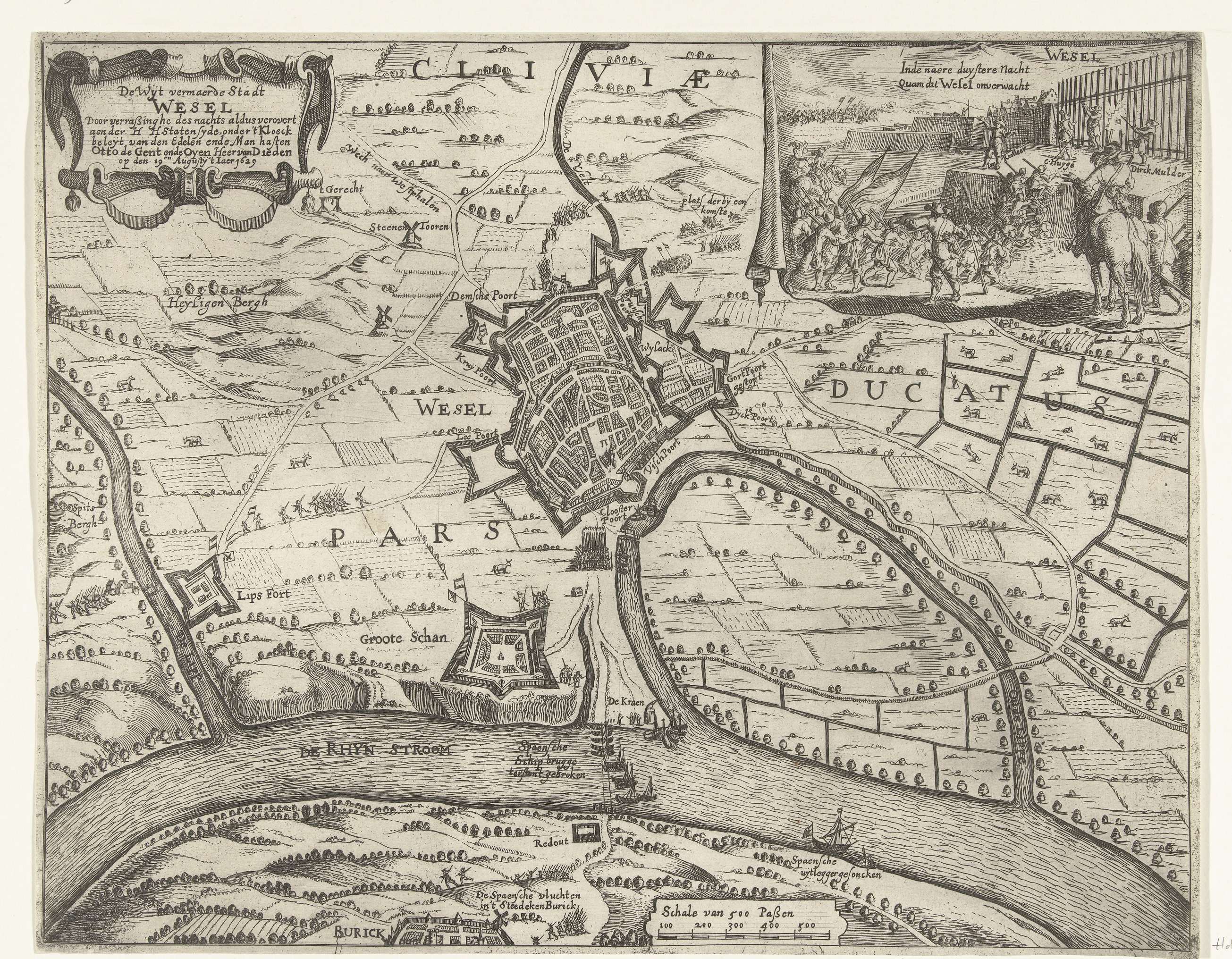 Kaart met de verovering van Wesel aan de Rijn bij verrassing door het Staatse leger onder kolonel Otto van Gent, in de nacht van 19 augustus 1629. Rechtsboven een cartouche waarop is te zien hoe het leger met hulp van Dirck en Pieter Mulder en Jan Rootleer de stad binnenkomen. Linksboven de cartouche met de ...