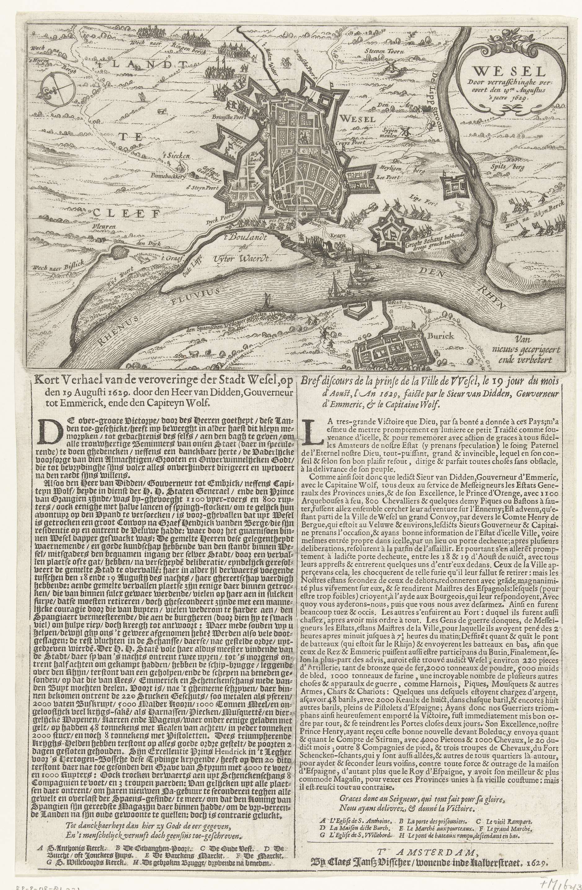 Verbeterde versie van de kaart met de verovering van Wesel aan de Rijn bij verrassing door het Staatse leger onder kolonel Otto van Gent, in de nacht van 19 augustus 1629. Rechtsboven de cartouche met de titel. Vastgeplakt onder de plaat een tekstblad met tekst en legenda's A-H in twee kolommen in het Nederlands en ...
