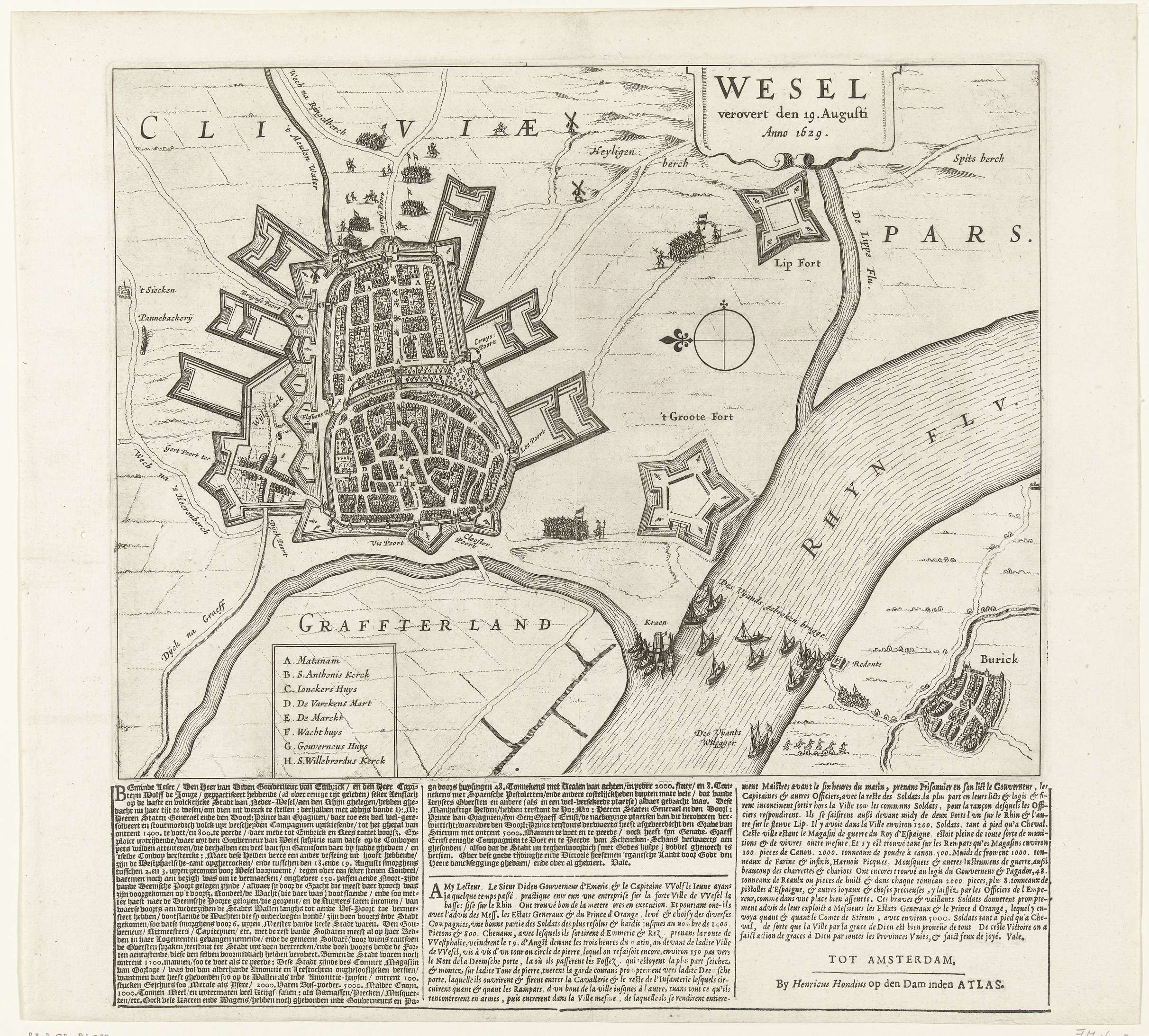 Kaart met de verovering van Wesel aan de Rijn in de nacht van 19 augustus 1629. Met tekst in 3 kolommen in het Nederlands en Frans gedrukt onder de plaat.