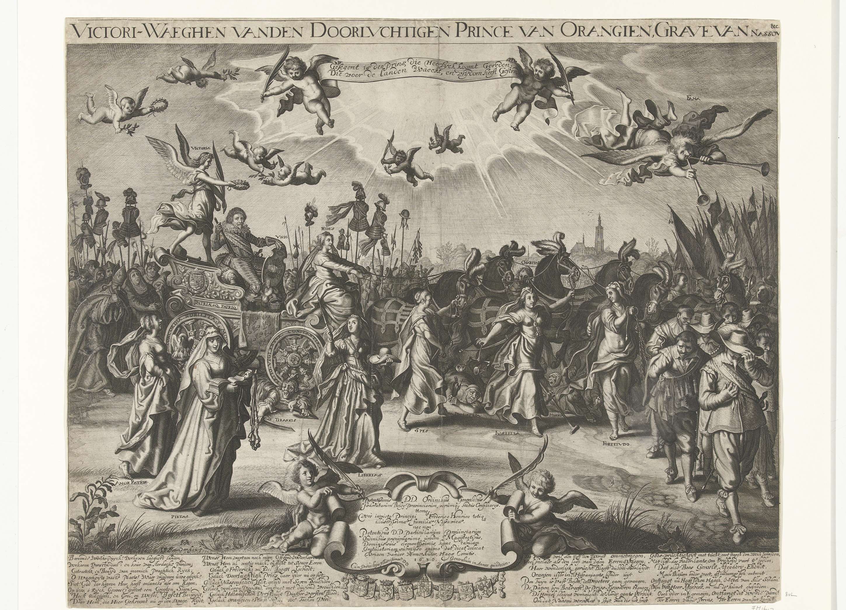 Allegorie ter ere van de veroveringen van Den Bosch en Wesel door Frederik Hendrik in 1629. Triomfoptocht met de stadhouder in een strijdwagen gemend door Geloof (Fides), de paarden begeleid door de deugden Hoop (Spes), Rechtvaardigheid (Justitia), Kracht (Fortitudo), Liefde (Charitas), Matigheid (Temperantia) en Voorzichtigheid (Prudentia). Links voor de wagen Liefde voor het Vaderland (Amor ...