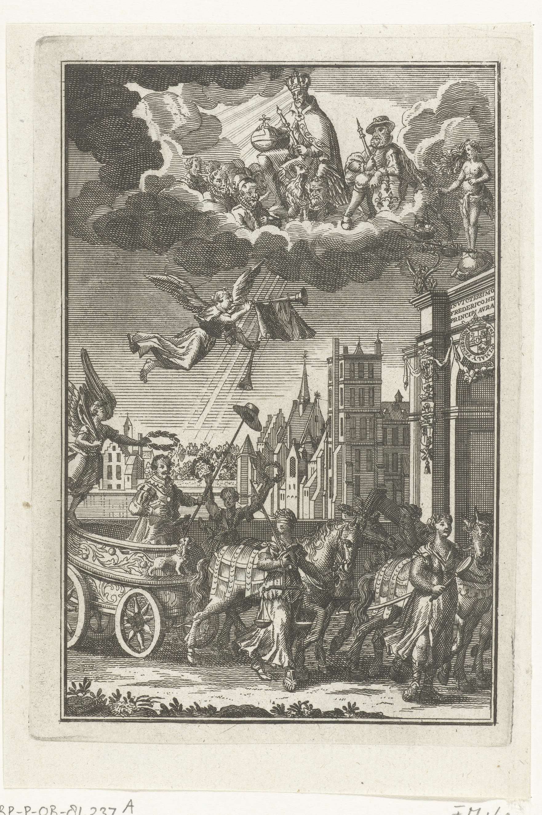 Allegorische triomfantelijke intocht van Frederik Hendrik door een triomfpoort in Den Haag. Allegorie ter ere van de veroveringen van Den Bosch en Wesel door Frederik Hendrik in 1629. Triomfoptocht met de door Overwinning gekroonde stadhouder met de vrijheidslans staande in een strijdwagen, de paarden begeleid door de deugden Rechtvaardigheid (Justitia), Kracht (Fortitudo) en Voorzichtigheid (Prudentia). ...