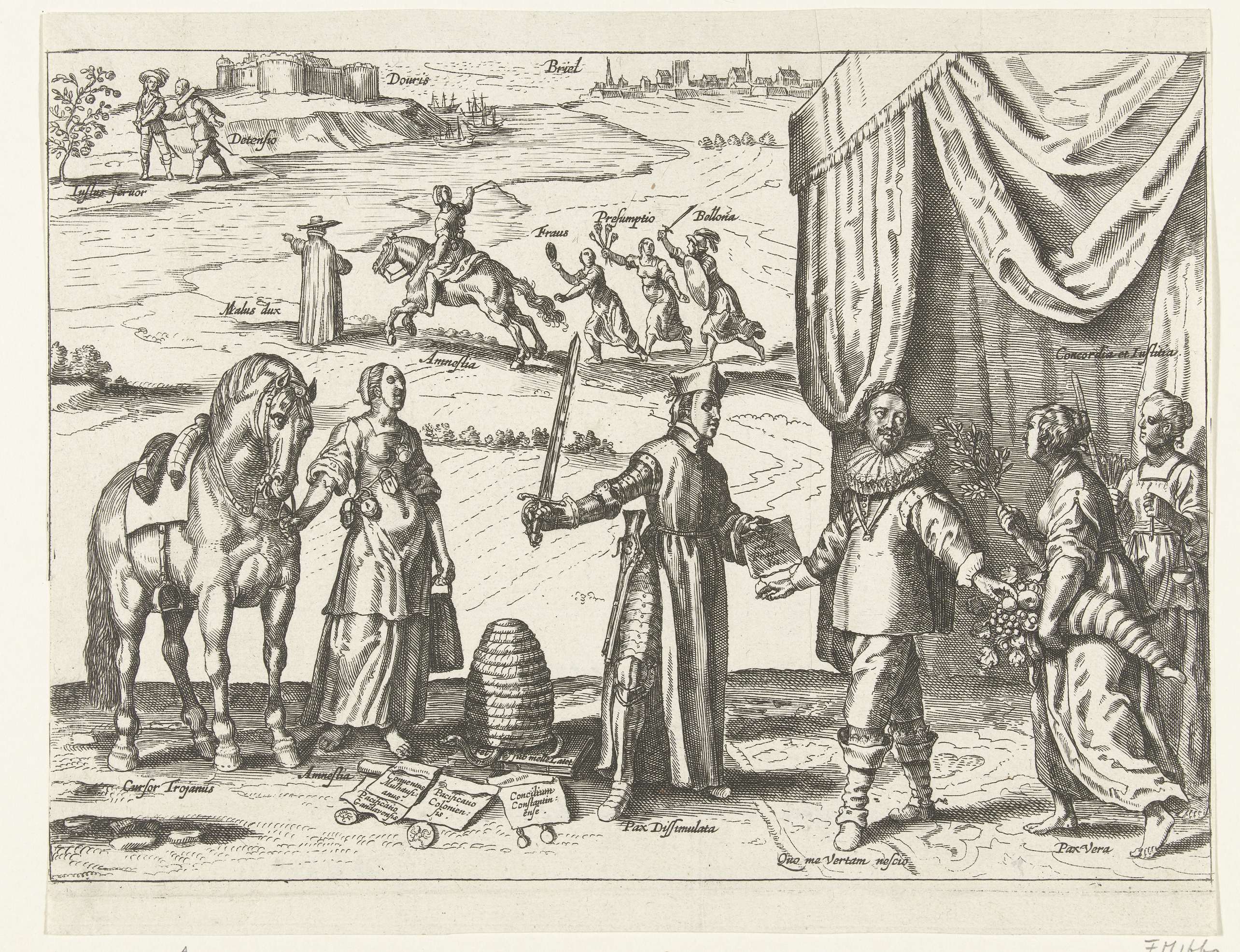 Allegorie op de voorgestelde Regensburger Amnestie, vredesbesprekingen te Regensburg om de Dertigjarige oorlog te beëindigen, 1640-1641. Allegorie waarin keizer Ferdinand III twijfelend staat tussen de ware vrede gepresenteerd door Eendracht (Concordia) en Gerechtigheid (Justitia) en de valse vrede, een jezuïet met een masker. Naast de valse vrede Generaal Pardon / Amnestie (Amnestia) met het Trojaanse ...