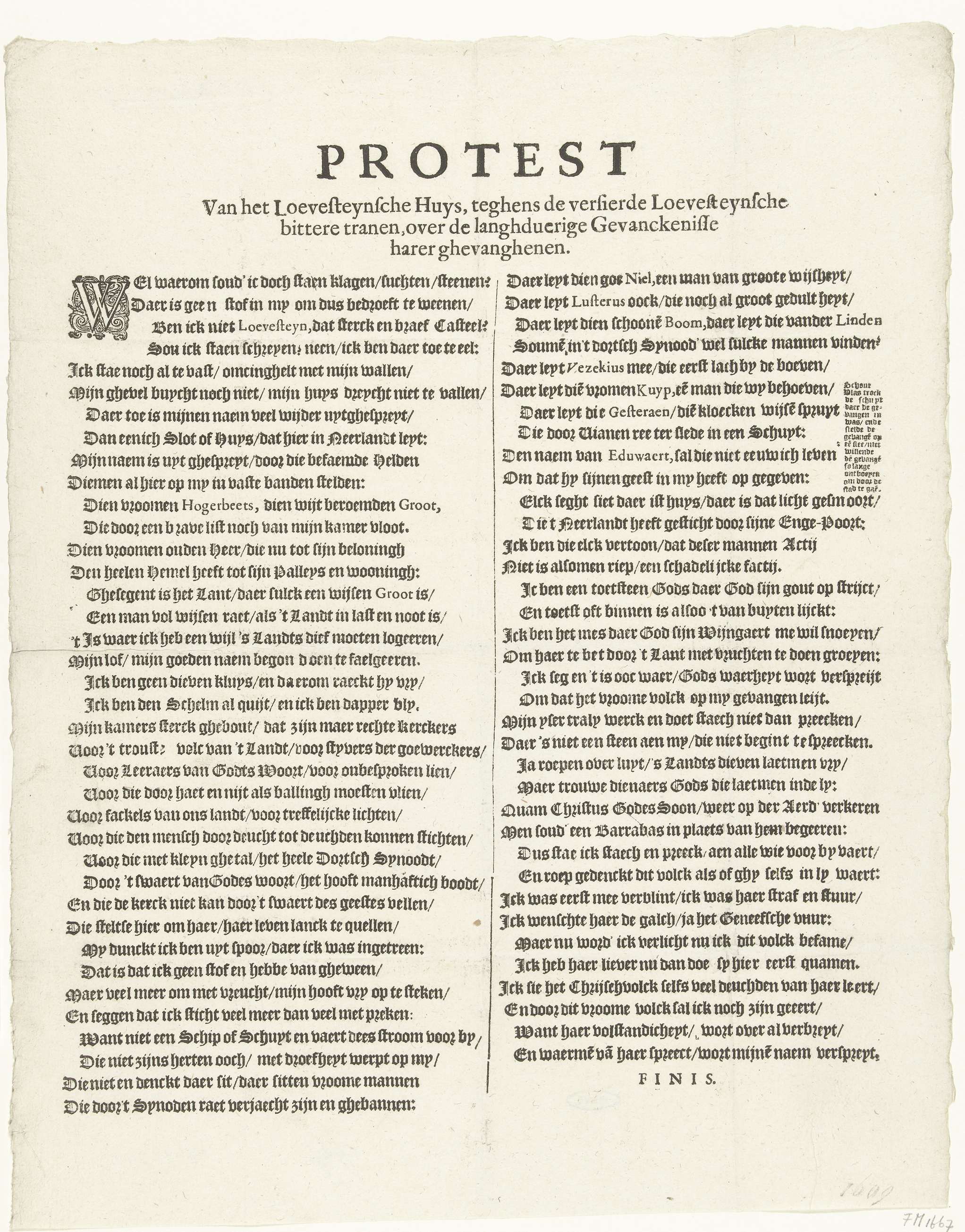 Gedicht tegen langdurige opsluiting van de Remonstrantse gevangenen in slot Loevestein, in de vorm van een protest, 1630. Gedicht in 2 kolommen.