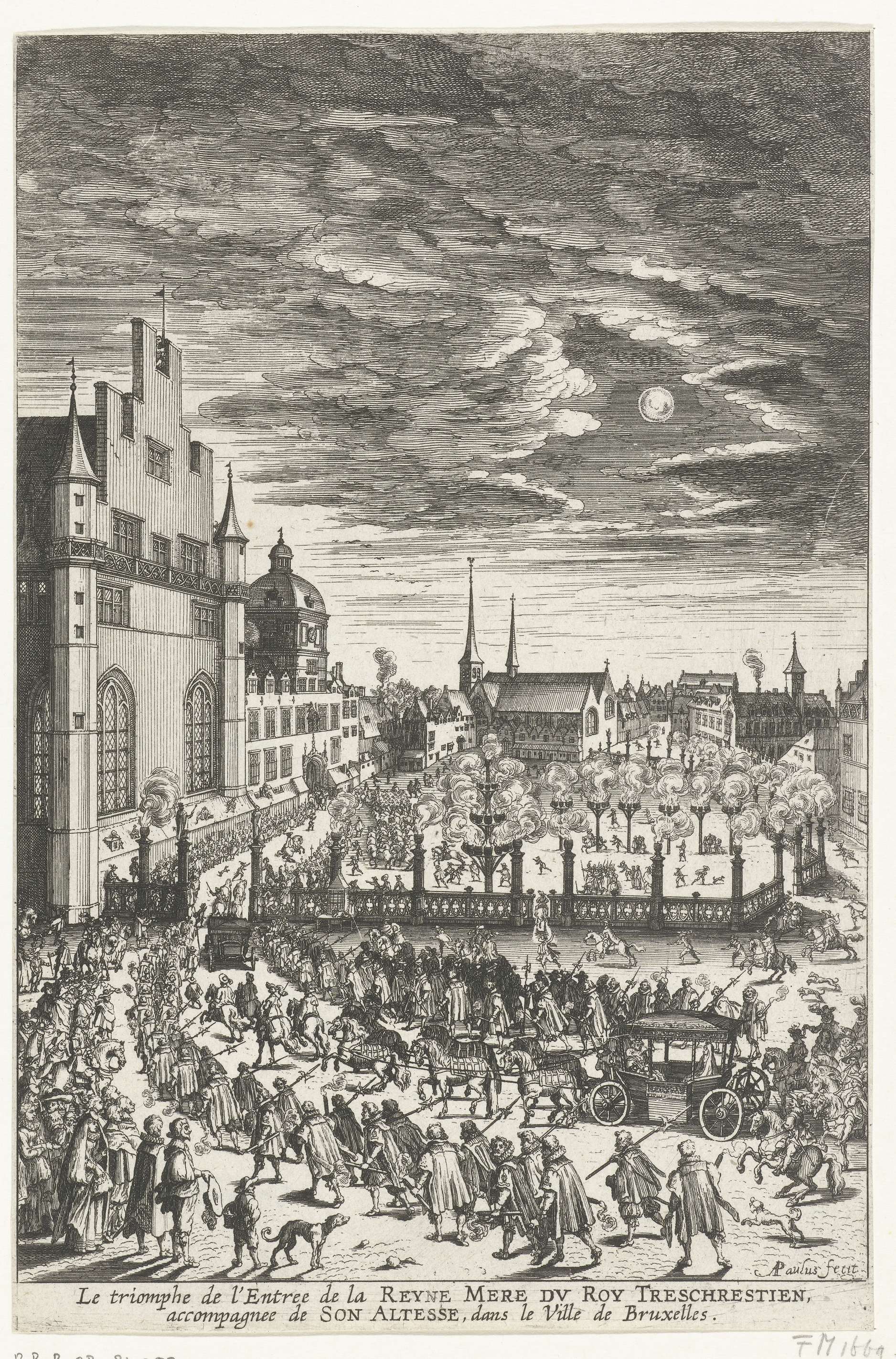 Intocht van de koets met Maria de' Medici en Isabella Clara Eugenia te Brussel, in de avond, 31 juli 1631. Het plein versierd met brandende pektonnen.
