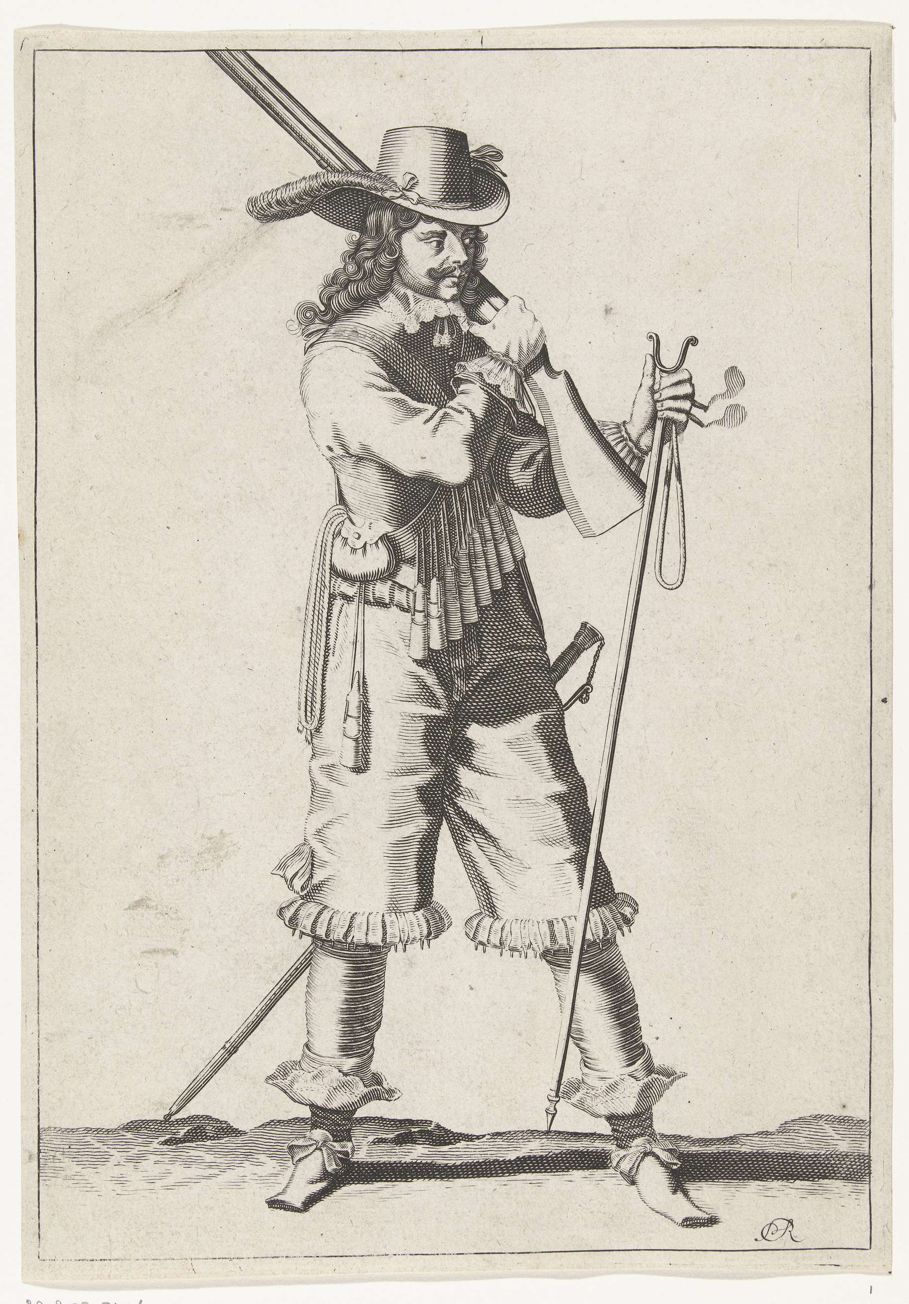 Een soldaat, ten voeten uit, naar rechts, die een musket (een bepaald type vuurwapen) met zijn rechterhand op zijn linkerschouder legt, de loop schuin omhoog wijzend. In zijn linkerhand een brandende lont en een een furket (musketvork), ca. 1645. Vrij naar plaat 33 in de instructies voor het hanteren van het musket in de Wapenhandelinghe ...