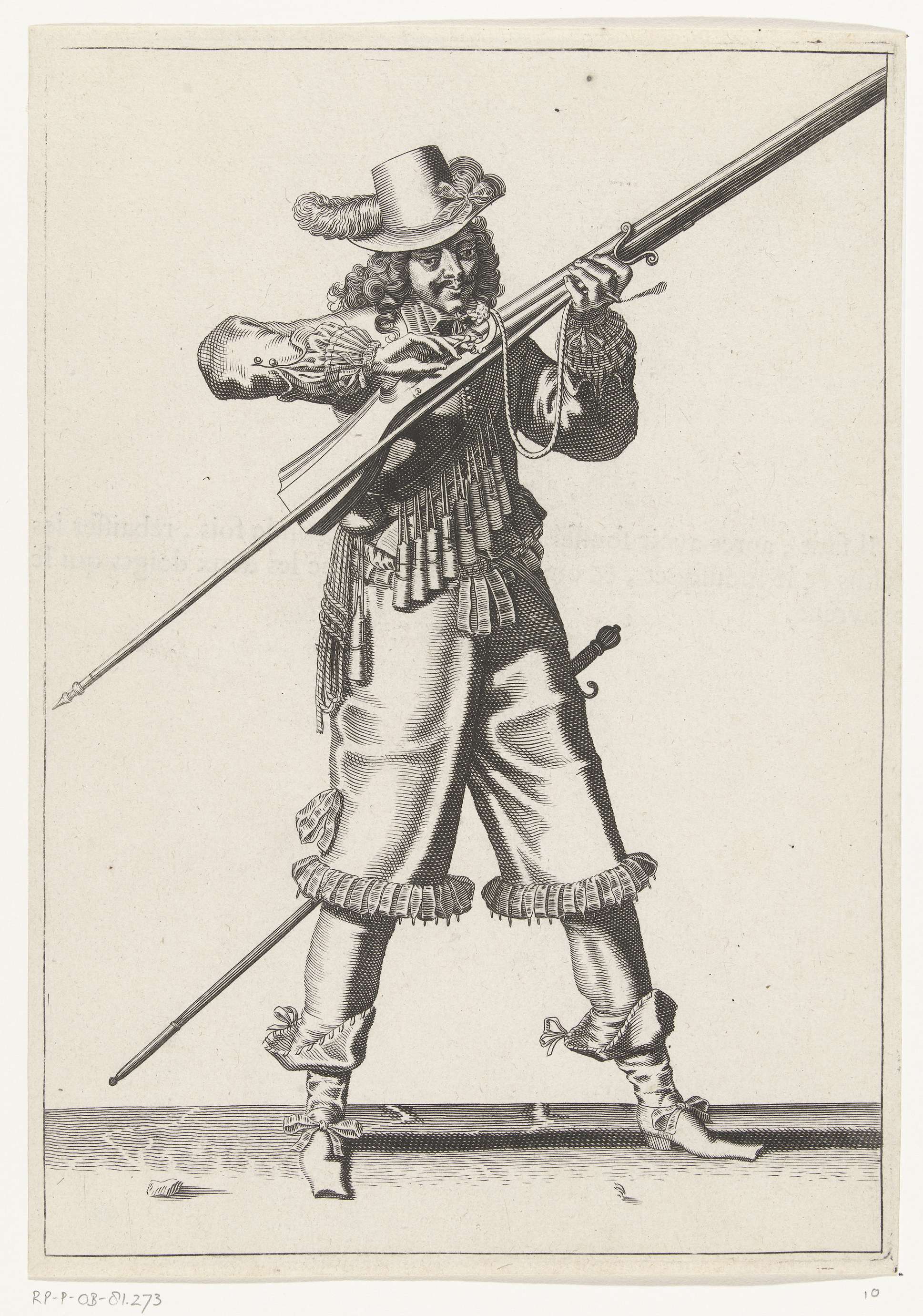Een soldaat, ten voeten uit, die een musket (een bepaald type vuurwapen) met zijn linkerhand vasthoudt. Op de haan (onderdeel van het ontstekingsmechanisme) van zijn musket ligt de brandende lont. Hij blaast hierover, onderwijl met de wijsvinger en de middelvinger van zijn rechterhand de pan (het kruitreservoir) van zijn musket bedekkend, om het kruit te ...