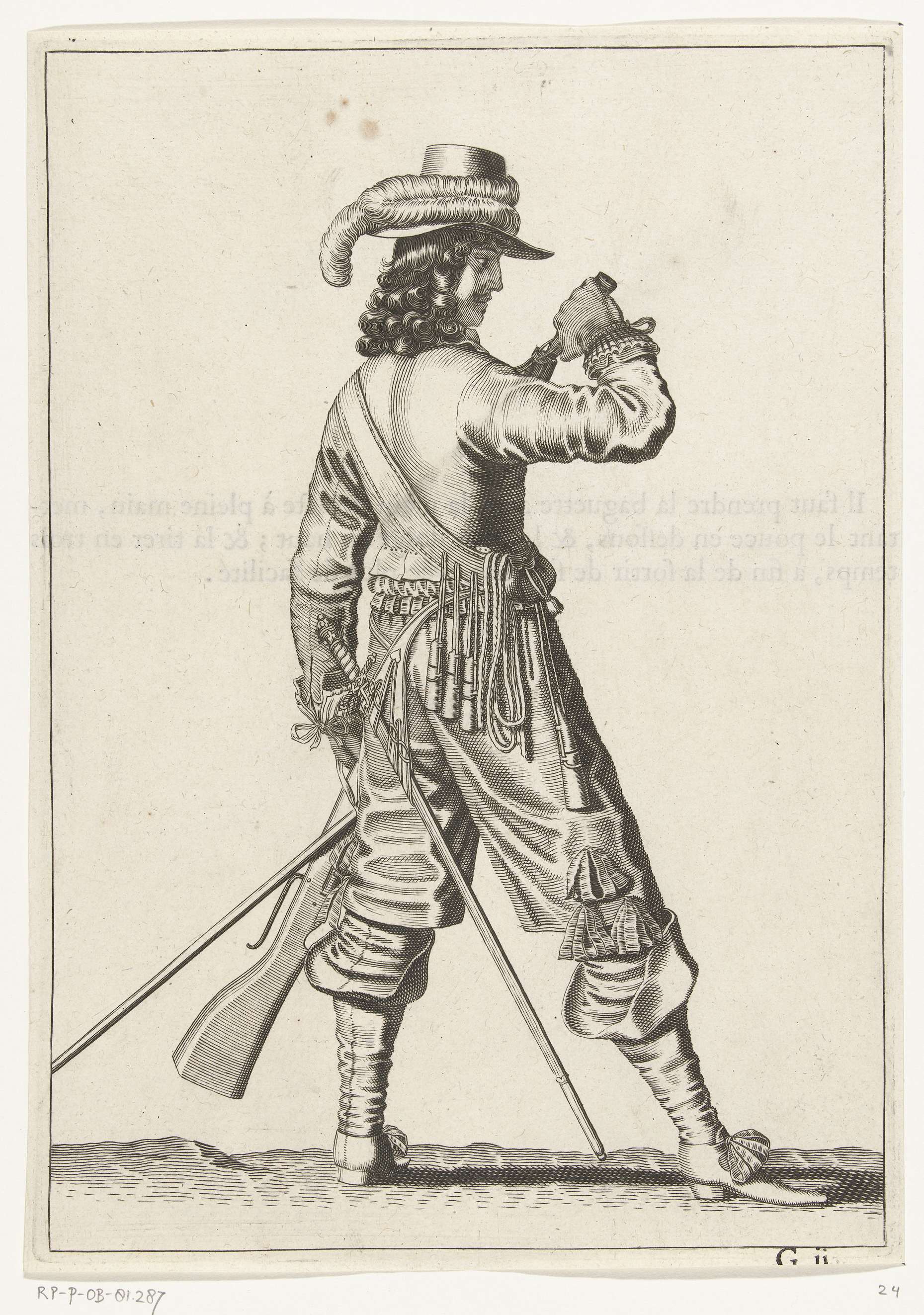 Een soldaat, ten voeten uit, naar rechts, op de rug gezien, die met zijn linkerhand bij zijn linkerdijbeen een musket (een bepaald type vuurwapen) vasthoudt. In zijn linkerhand behalve het musket ook een lont; aan zijn linkerpols een furket (musketvork). Met zijn rechterhand giet hij kruit uit een kruitmaatje in de loop, die schuin omhoog ...