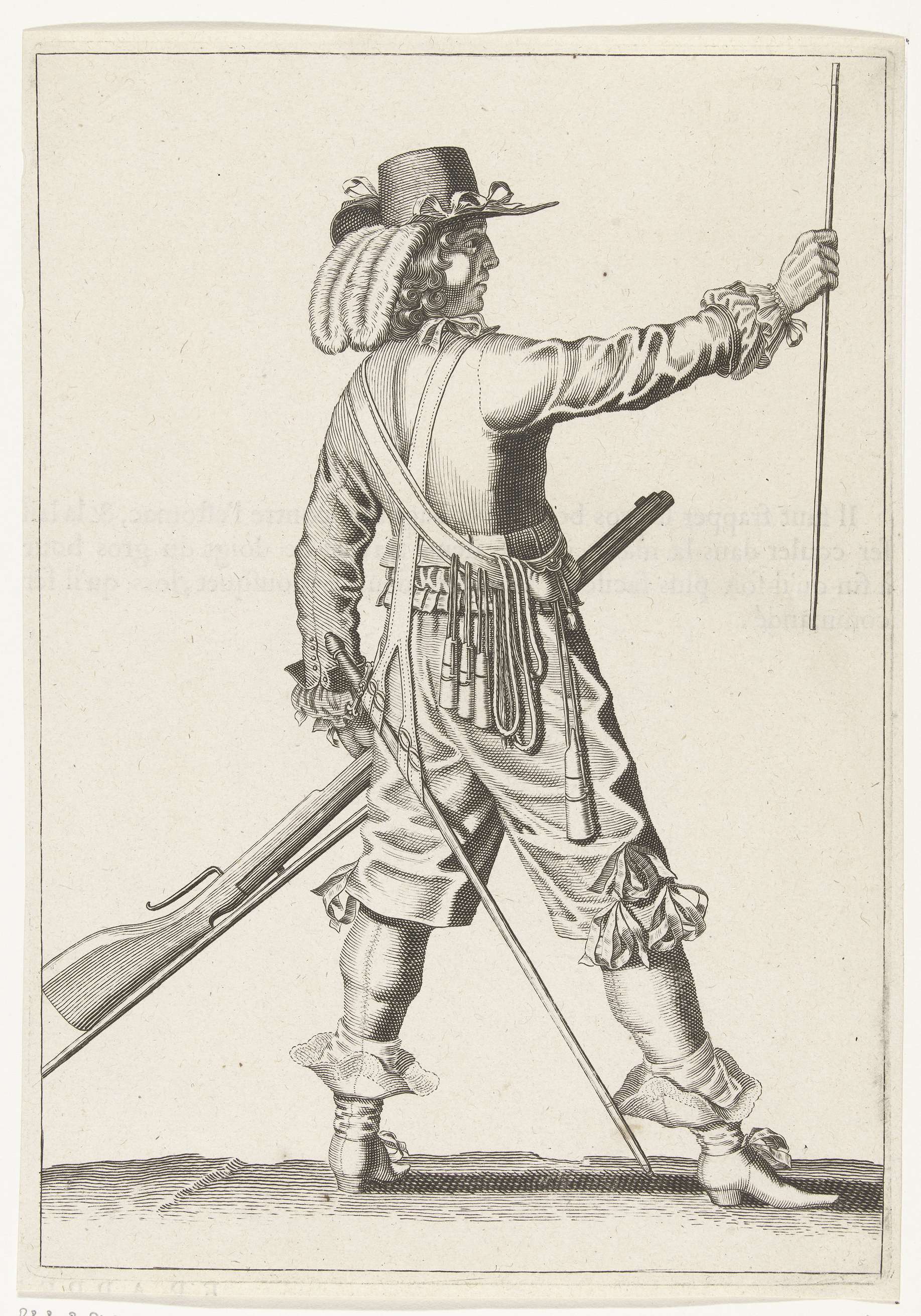 Een soldaat, ten voeten uit, die met zijn rechterhand de laadstok van zijn musket recht voor zich houdt. In zijn linkerhand het musket. Bedrukt op achterzijde met tekst in het Frans. Nieuwe voorstelling niet ontleend aan de instructies voor het hanteren van het musket in de Wapenhandelinghe van J. de Gheyn. Krijgswezen rond 1600.