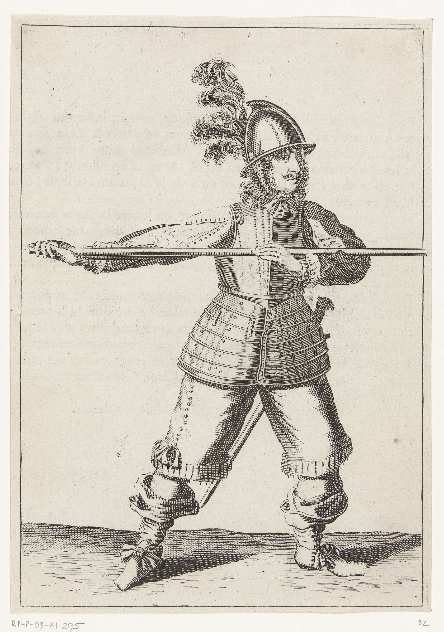 Soldaat die zijn spies met beide handen horizontaal op schouderhoogte draagt, zijn rechterhand bij de voet van het wapen, ca. 1645