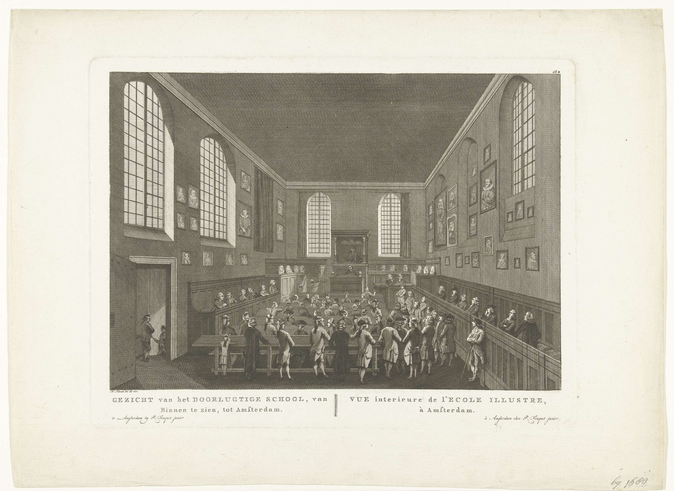 Interieur van het Athenaeum Illustre, de voorloper van de Universiteit van Amsterdam, aan de Oudezijds Voorburgwal te Amsterdam. Deze onderwijsinstelling was in 1631 gesticht en gevestigd in de Agnietenkapel. In de zaal wordt een college gegeven aan studenten. Onder de voorstelling de titel in het Nederlands en Frans. Rechtsboven genummerd: 28*.