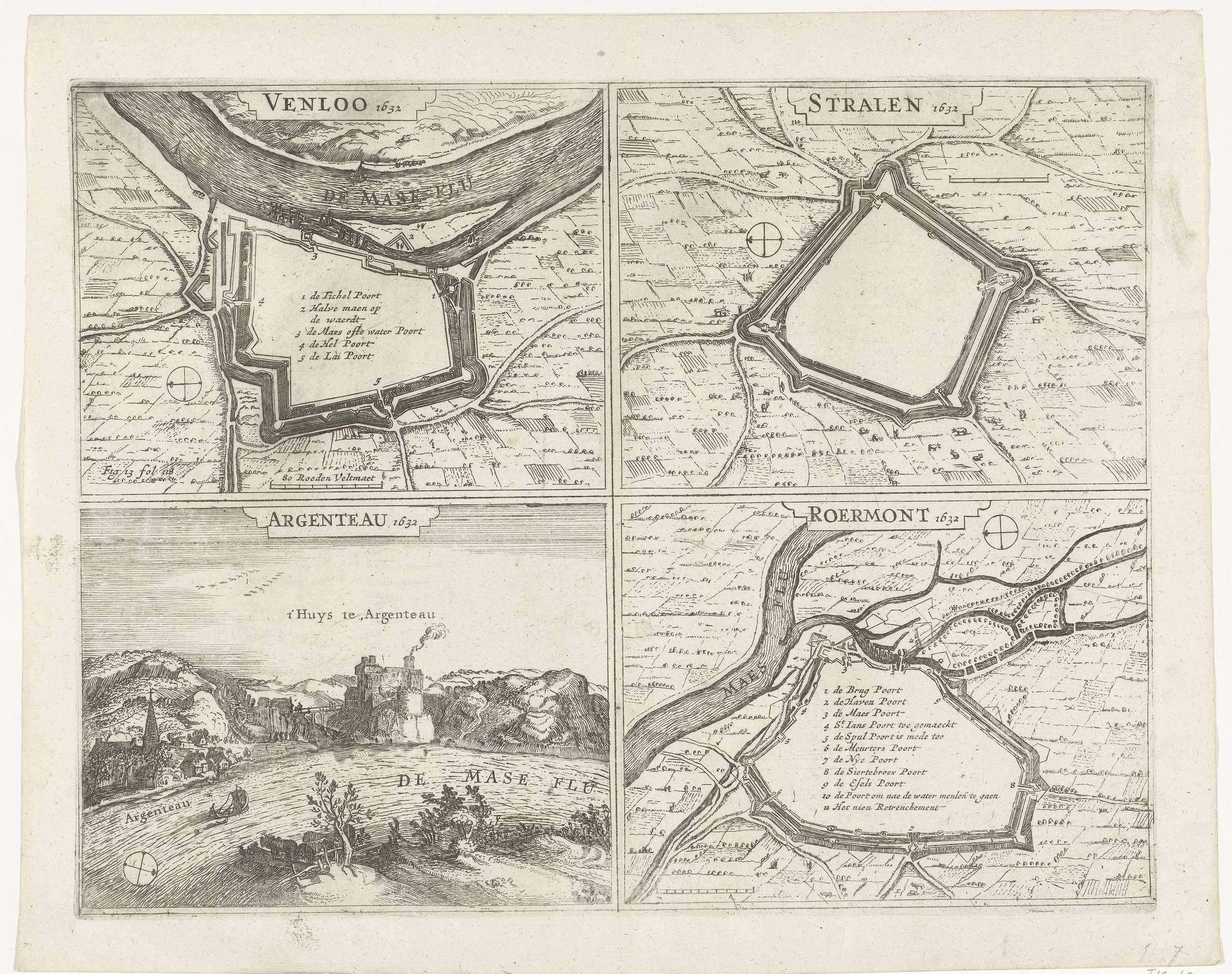 Blad met vier voorstellingen: drie plattegronden van de plaatsen Straelen, Venlo en Roermond en een gezicht op het kasteel van Argenteau, gelegen aan de Maas. Alle vier plaatsen veroverd door Frederik Hendrik in het jaar 1632. Gemerkt linksboven: Fig. 13 fol. 118.