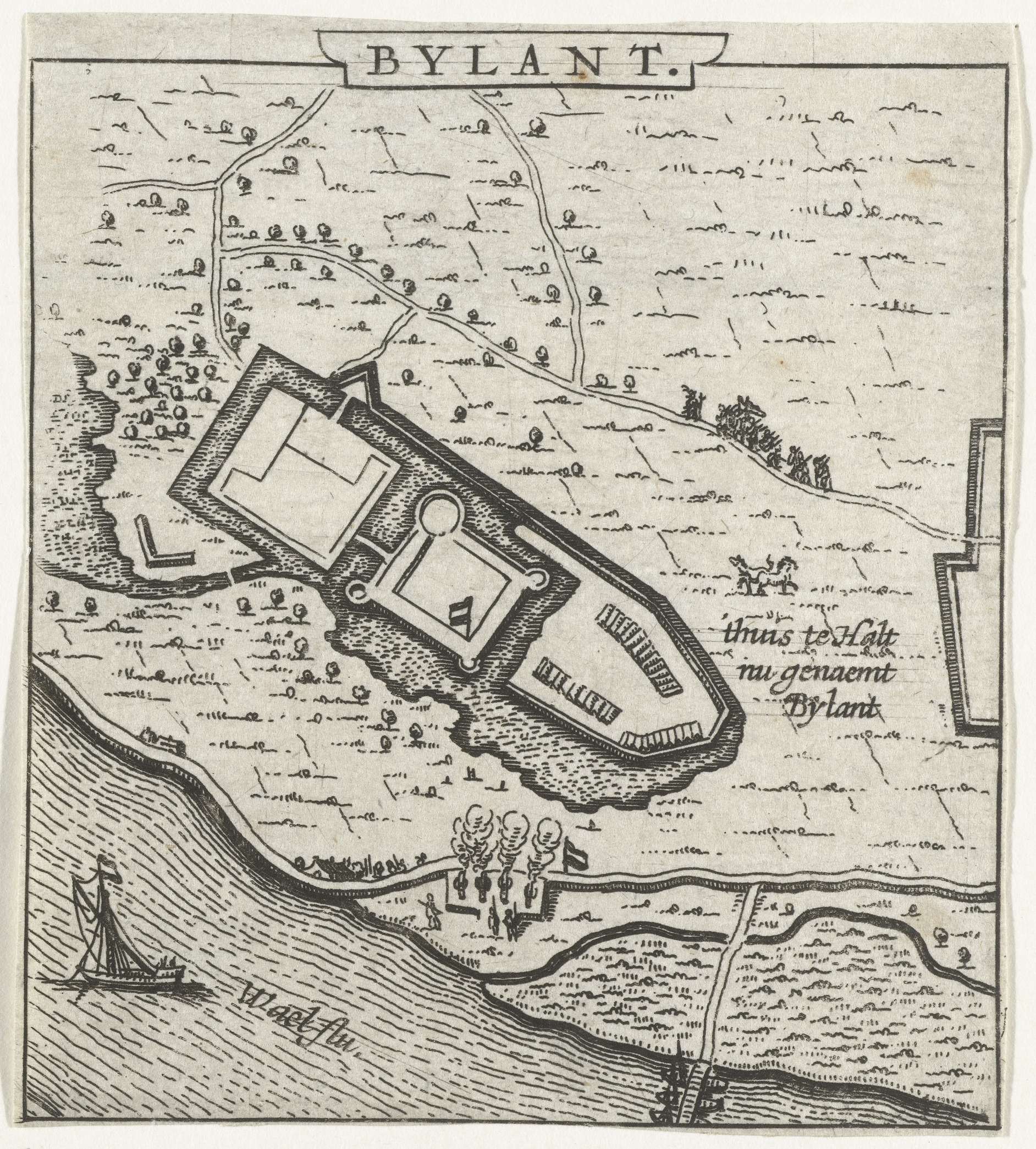 Plattegrond van Huis Bylandt, vroeger bekend als Huis te Halt. Onderdeel van een groep plattegronden van steden, forten en dijken in Brabant veroverd door het Staatse leger onder Frederik Hendrik in de jaren 1631-1632.